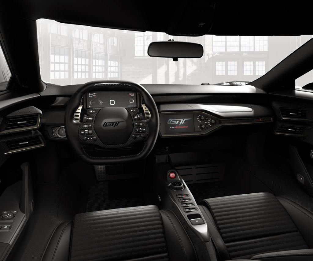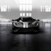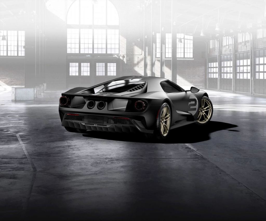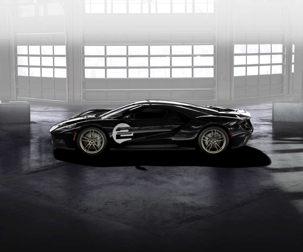 The Heritage GT comes with a Shadow Black exterior in either gloss or matte finish with silver stripes and exposed carbon fiber package, Frozen White #2 hood and door graphics, and 20-inch one-piece forged aluminum wheels in a gold satin. Inside, carbon-fiber seats in Ebony leather with pillowed inserts and plow-through stitching, Ford GT logo embossed in the headrests and the wheel, Ebony-leather wrap instrument cluster with gold detailing, exposed matte carbon fiber door sills, air register pods and center console and a serialized identification plate as well as more #2 graphics are the among the main features.