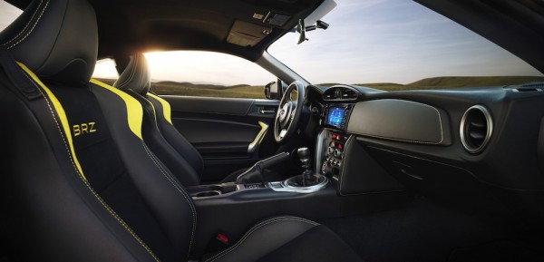 So the 2017 Subaru BRZ Series Yellow comes with, as its name suggests, a special yellow exterior and a black leather and Alcantara interior with contrasting yellow stitching on seats, door and dash panels, steering wheel, knee pads and shifter booth, carpeted floor mats, and yellow BRZ logo. Being a 2017 model, the car also gets some new LEDs, a rear spoiler, and a 4.2-in LCD multifunction display as well as dual-zone automatic climate control, Keyless Access with Push-Button Start, dual illuminated visor vanity mirrors, and front door courtesy lights.