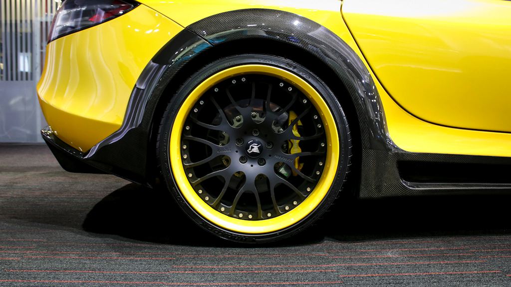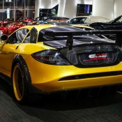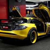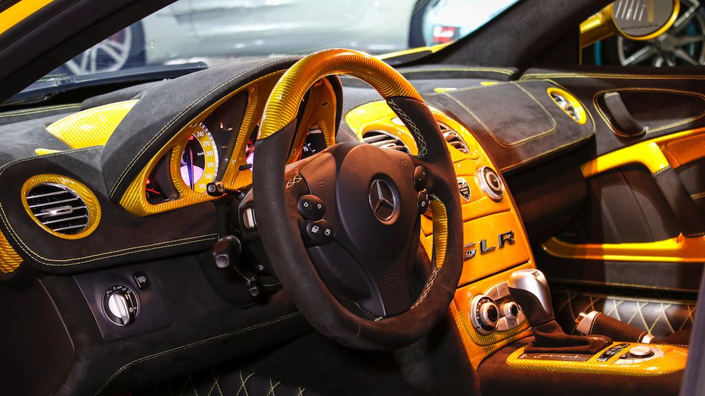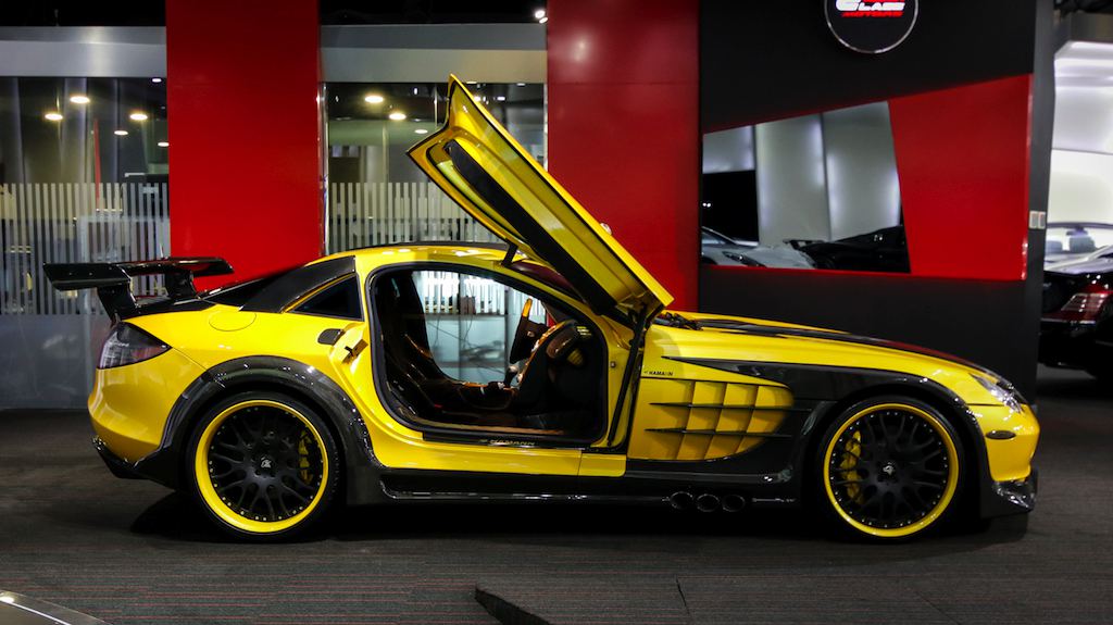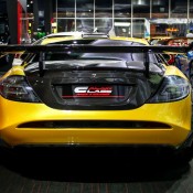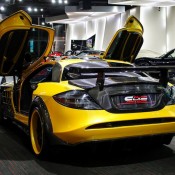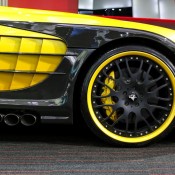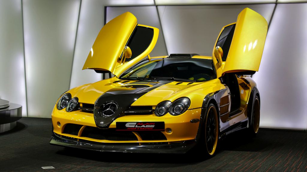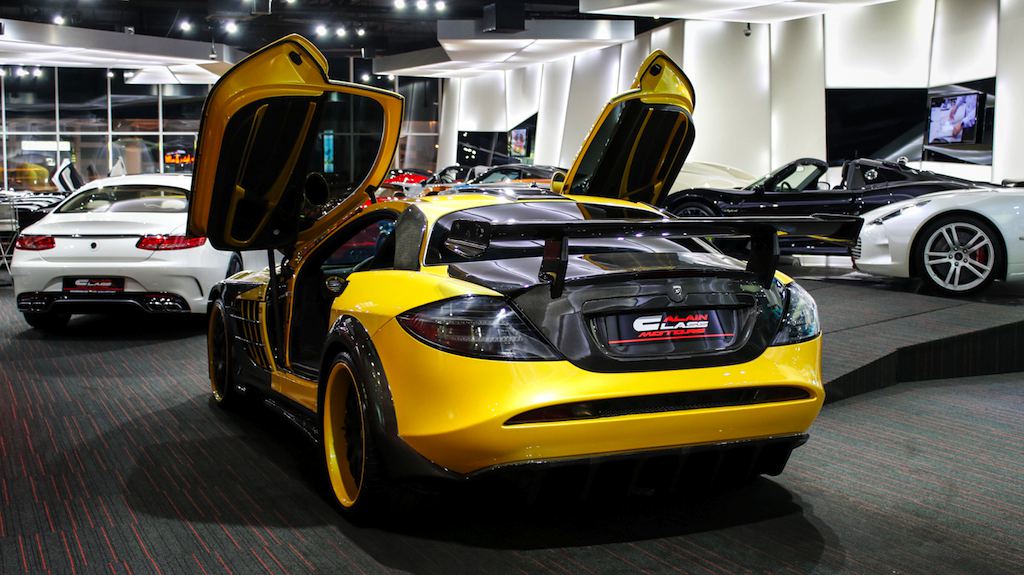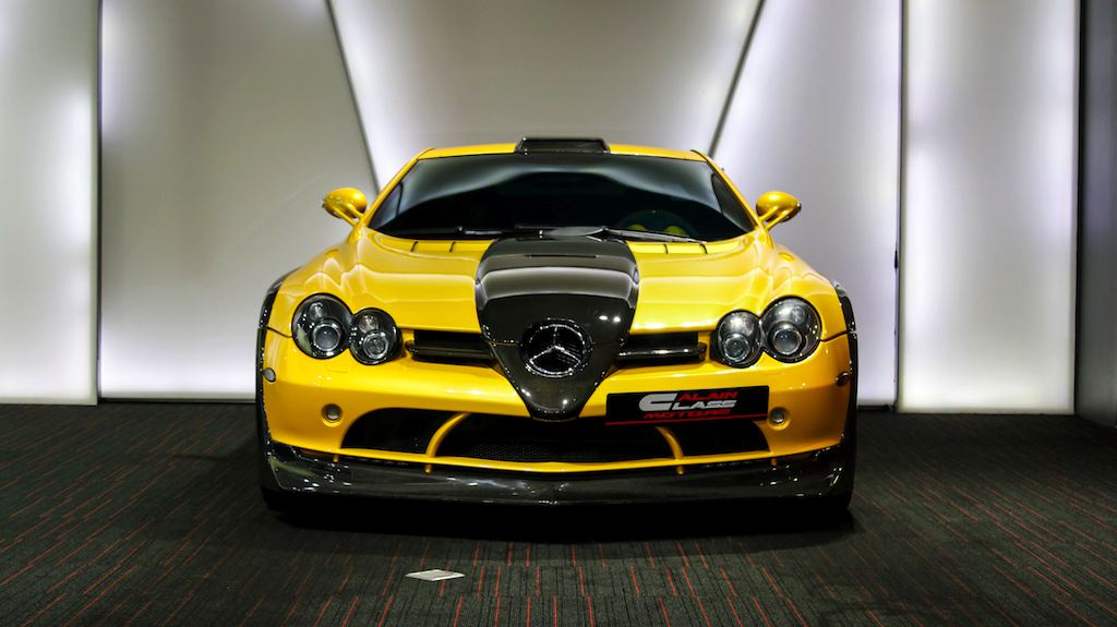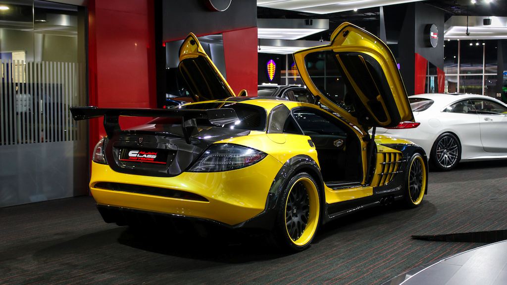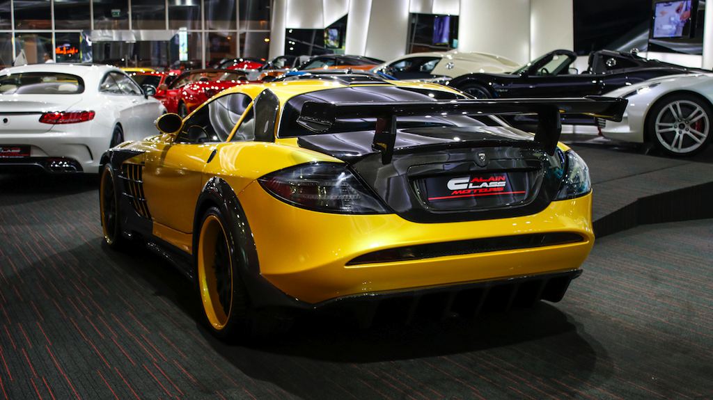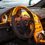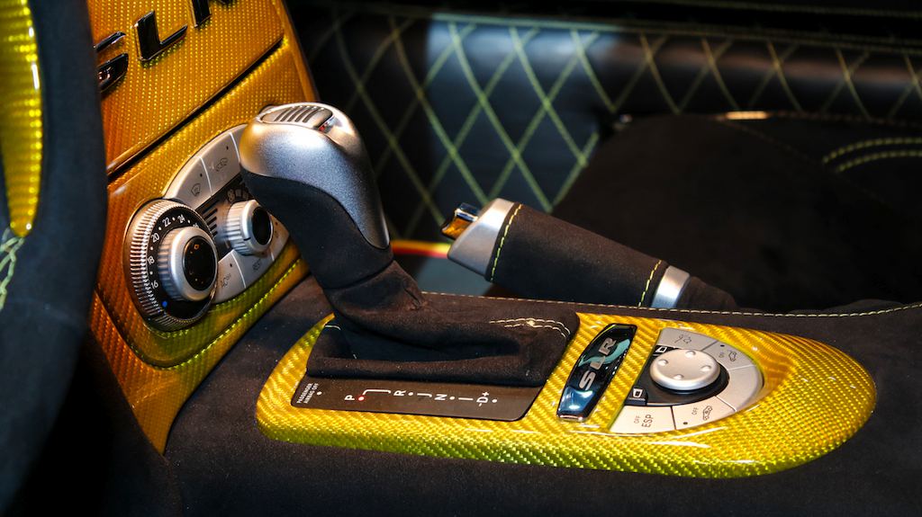Outside the opposite is true, with the yellow being the dominant color and the naked black of the carbon bits complementing it. The same theme is applied to the wheels which feature a matte black face and yellow lips. The one-off Bumblebee SLR is currently on sale a Alain Class Motors.