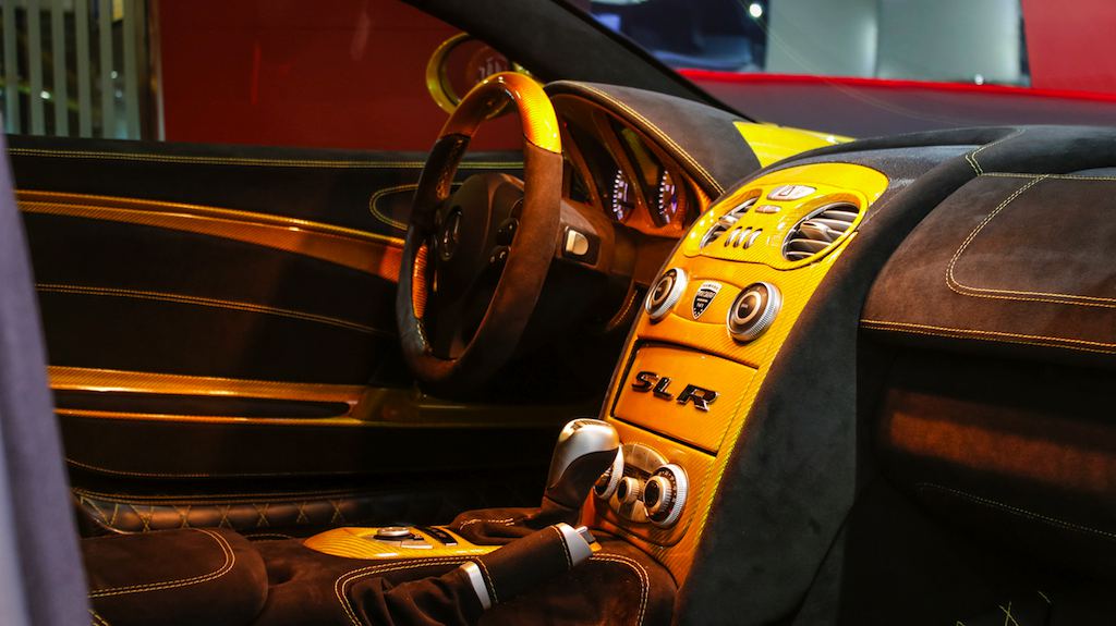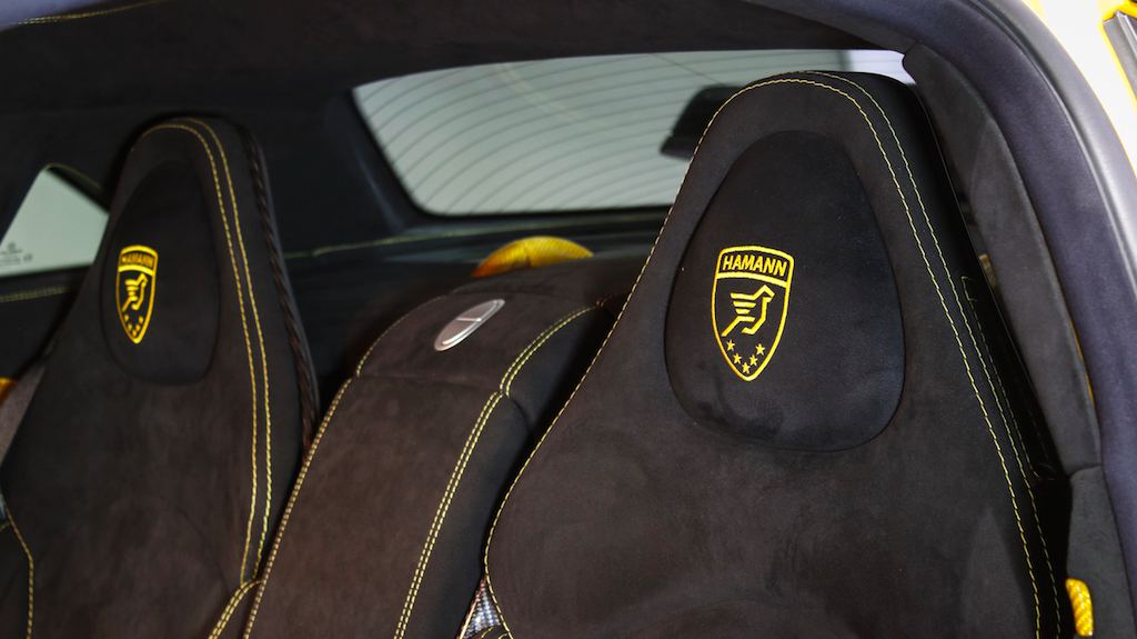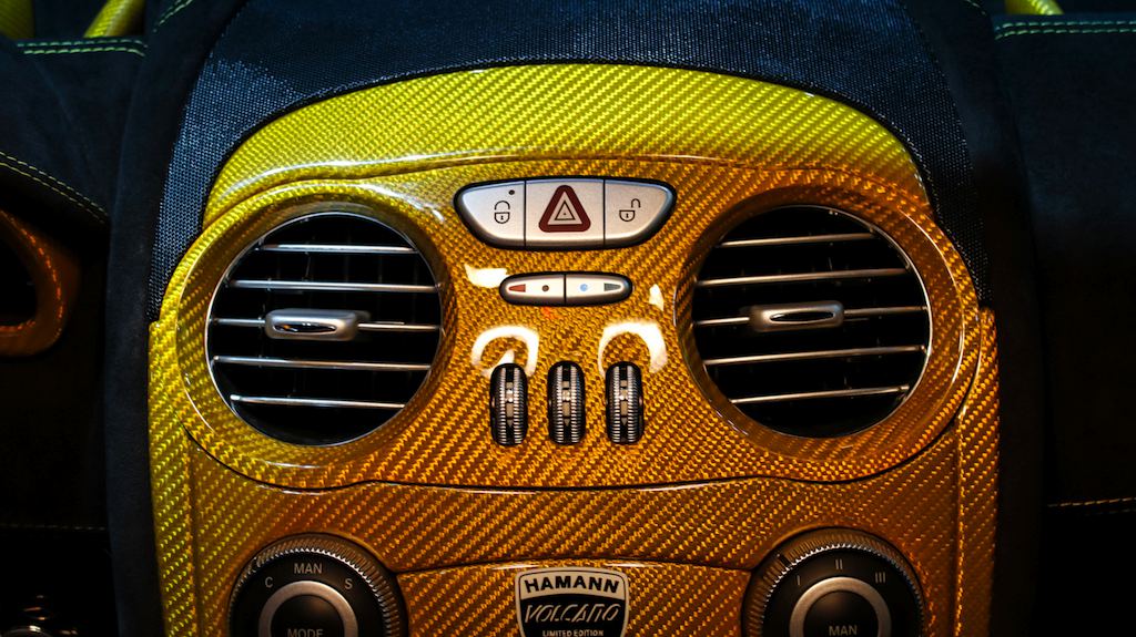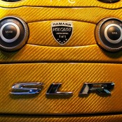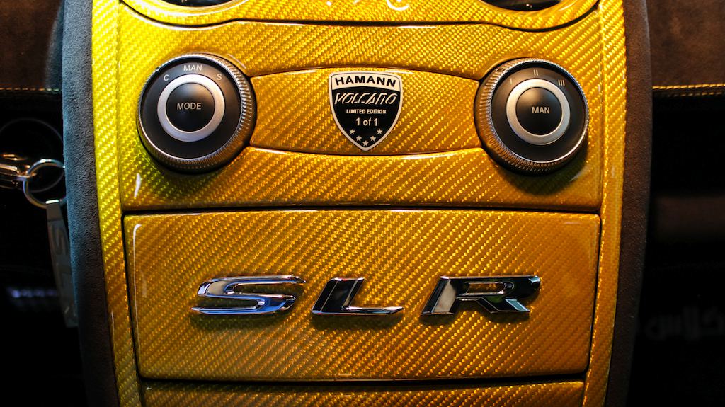 As mentioned, this car is the only Hamann SLR Volcano in this color and specs on the evidence of a special plaque on the center console attesting to the fact. Inside the cabin you will also find yellow carbon fiber and black Alcantara garnished with yellow stitching is diamond patter and embroideries of the tuner’s logo.