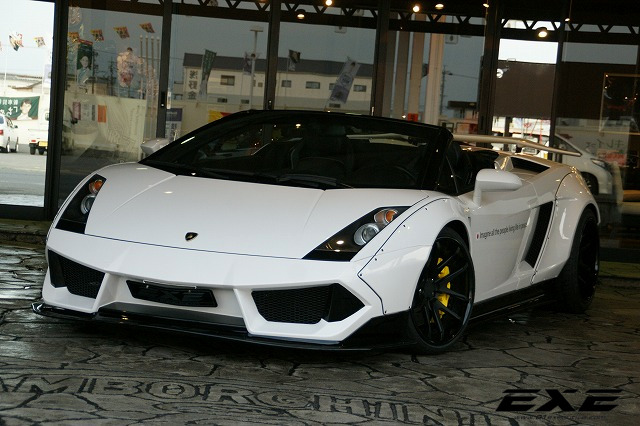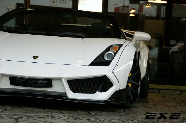 The body kit on this custom Lamborghini Gallardo Spyder by EXE consists of the usual LB-Works elements including bolt on fenders on the front and rear complete with sills and custom bumpers, but it also features a unique aero kit with front and rear spoilers and diffuser. The car also boasts a lift kit system, 19 inch Rotiform wheels, Kreissieg adjustable exhaust system and a power kit for an extra ten or so horsepower.