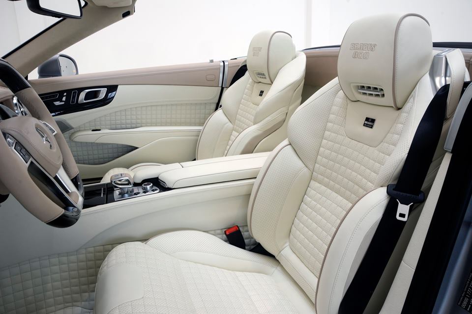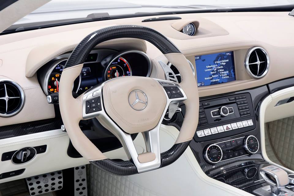 While every bit of Brabus Mercedes SL65 800, a two-seater that can easily set you back half a million dollar, is customizable, this one comes with a rather dull interior with white and beige leather, but it also has some nice carbon fiber trims and still pedals. Again, it doesn’t seem like a good idea to have a light colored interior in a car with a folding roof. It’s all going to get messed up and dirty. Not that owner will care, but still.