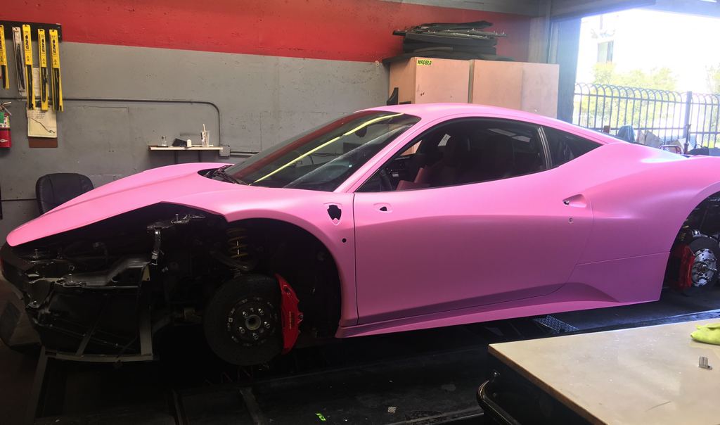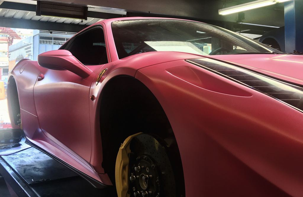 The visual modifications with a new front bumper featuring a prominent spoiler lip and large air intakes which eliminate the 458’s own aero blades. Then there is the window tint and the black wheels, and these mods would have led any onlooker to believe this car was about to get a mean and aggressive look. Then they applied the satin pink wrap.