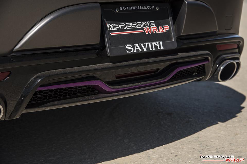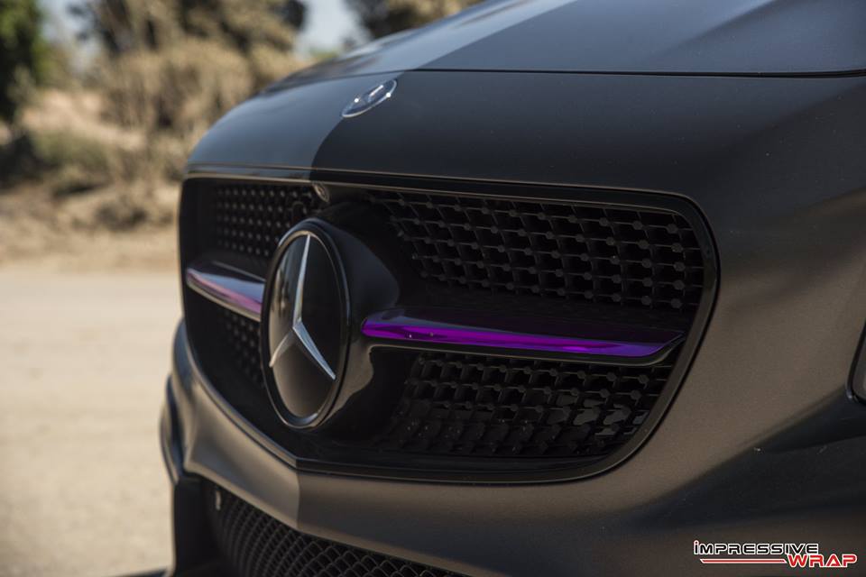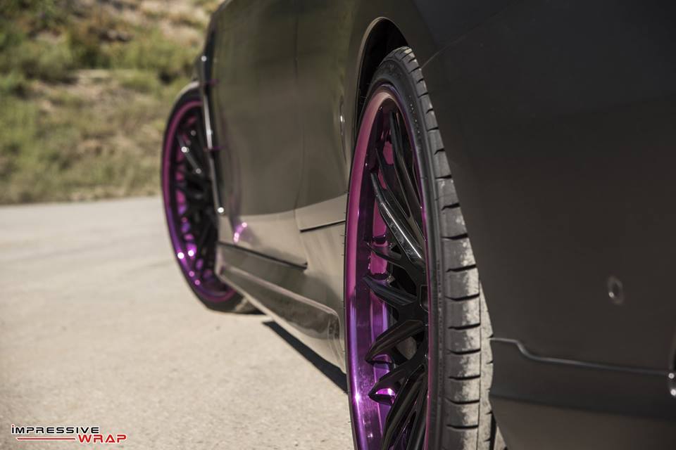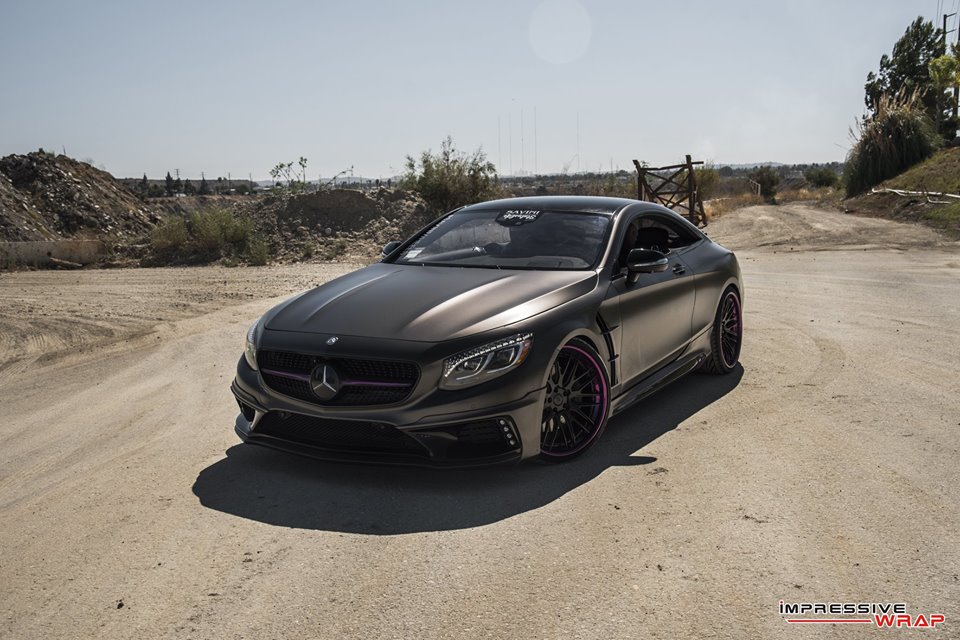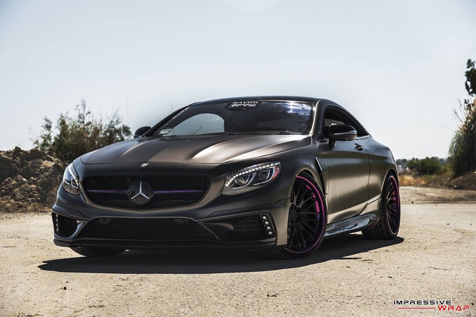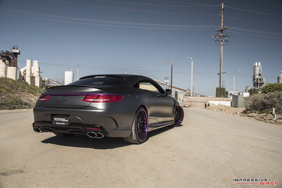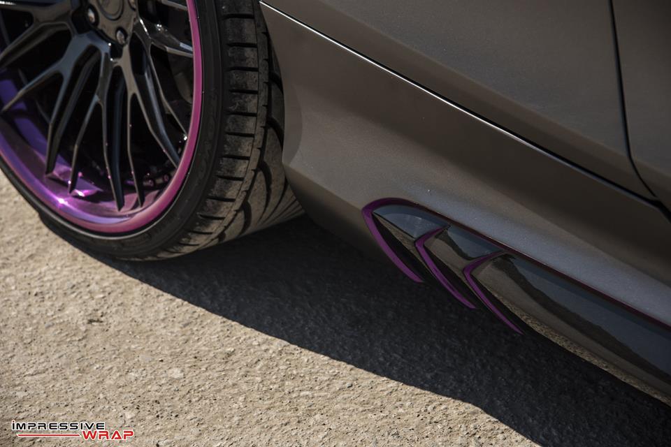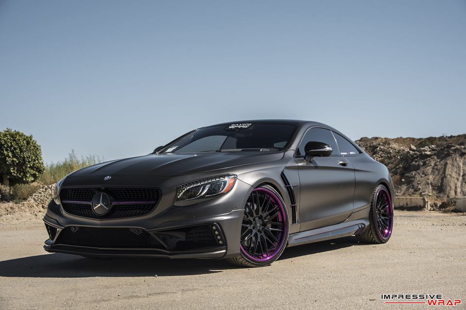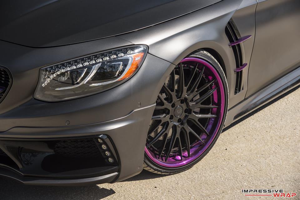 With those bits on the Nero Mercedes S550 Coupe was then sent to Impressive Wrap to get the final and most important mod of this treatment. Here they wrapped the car in a very sexy Satin Pearl Nero and then garnished it with chrome purple accents. You find the purple touches on the front and rear aprons, on the aero parts, side vents, skirts, front grille, even around the outer lips of the wheels.