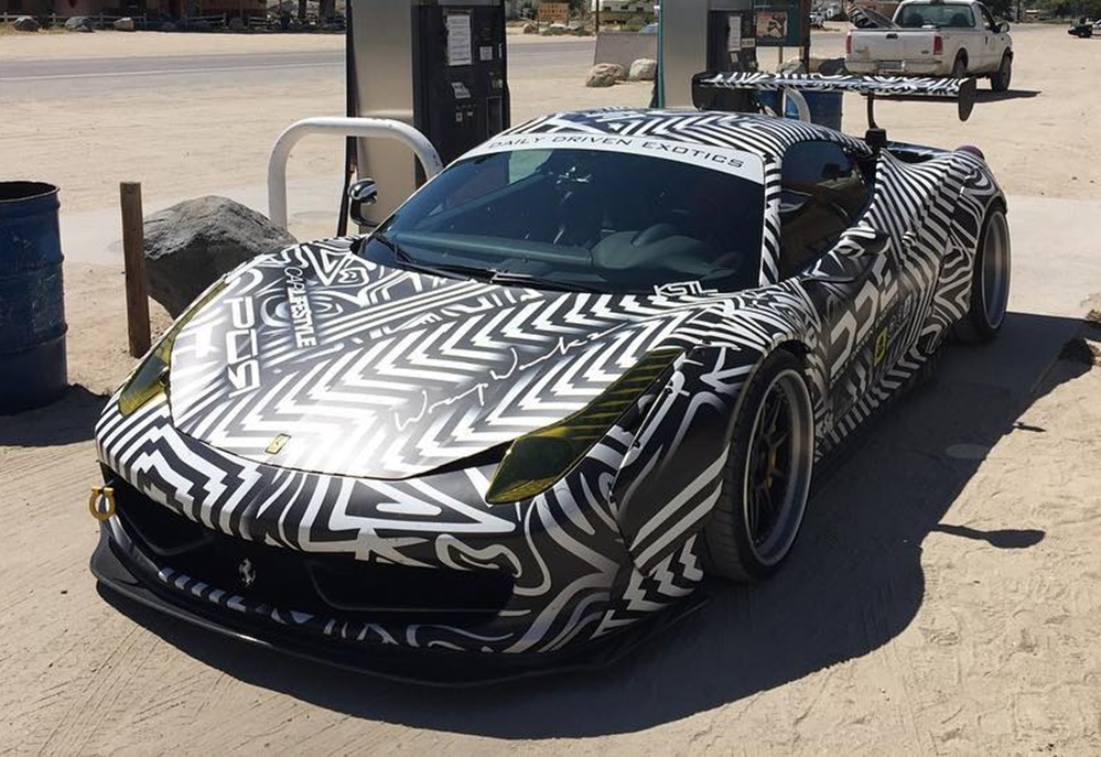 As it turns out Monterey Car Week has not been all sweetness and light. In one of the less savory occasions at the event a one-of-a-kind Liberty Walk Ferrari 458 got damaged almost beyond recognition. Well, the face is ruined, but that special wrap on the car will probably help you remember when you saw this bad boy last.