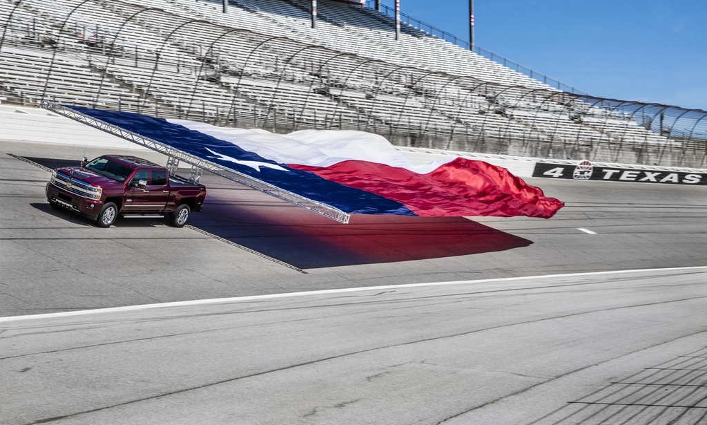 With 445 horsepower (332 kW) and 910 lb.-ft. of torque (1,234 Nm) from a Duramax 6.6L V-8 turbo-diesel engine, the flag pulling Chevrolet Silverado completed four laps around the Texas Motor Speedway without the lag touching the ground. The Guinness only needed a 100 meters, so it is fair to say the Silverado really outperformed there. If Chevy’s marketing people are clever they will come up, in light of this event, with a special “Murica, F*ck Yea!” edition.