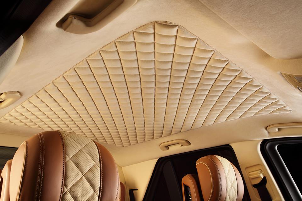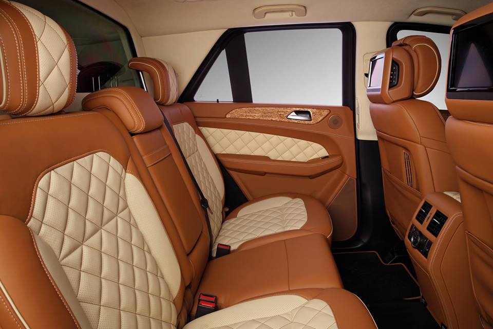 On this TopCar Mercedes GLE the wood trimming is complemented with a heavy dose of light brown and cream colored leather on the seats, dashboards, and door cards, as well the consoles and the steering wheel, while the headliner and the visors are covered with Alcantara and boast a lovely diamond pattern stitching. Some may find the color scheme a bit too chocolaty, but no one can question the craftsmanship.