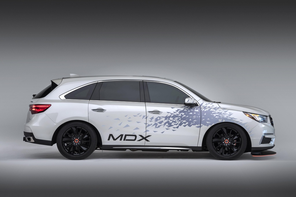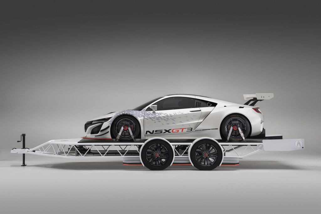 And all three are part of the same display, with the MDX pulling the trailer on which you find the NSX GT3. The pimped-out 2017 Acura MDX prepared for this purpose features three quarter inch lowering on both axles, black-out suspension components for some reason, 20-inch black rims and tires, tinted windows, towing package including bumper, electrical and transmission cooling package, and NSX-inspired front fascia as well as wrap and exterior accents.
