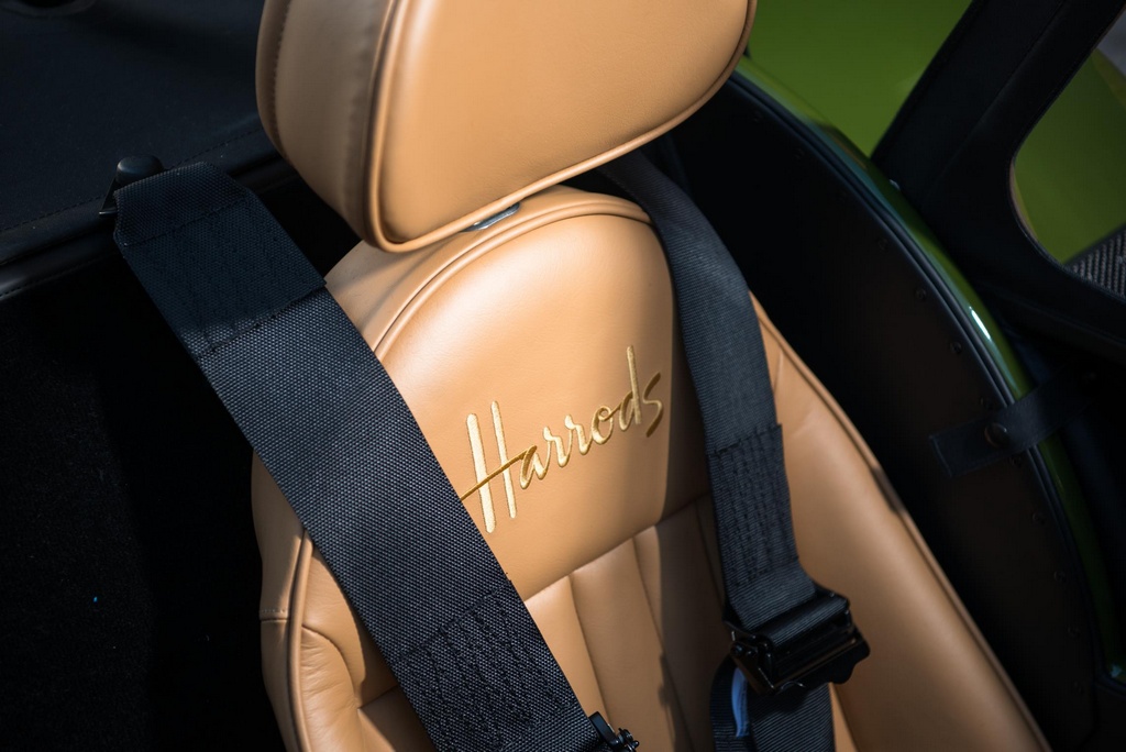 As for the special highlights of Caterham Seven Harrods, the car comes in Harrods green, with a custom white stripe and gold pinstripe while, and a gold power-coated chassis. Inside the cockpit, the butterscotch leather upholstery also reflects Harrods’ colour scheme, while the store name is embroidered on the seat backs and the Harrods ‘H’ adorns the gear knob.