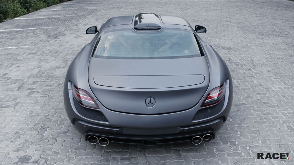 In their recent touch up for the FAB Design Mercedes SLS, RACE! Gave the car a fresh matte grey wrap from 3M and installed a new set of wheel in matching colors. What’s more, they have darkened the lights and blackened all the logos and details on the exterior, making the car that much more aggressive and sporty.