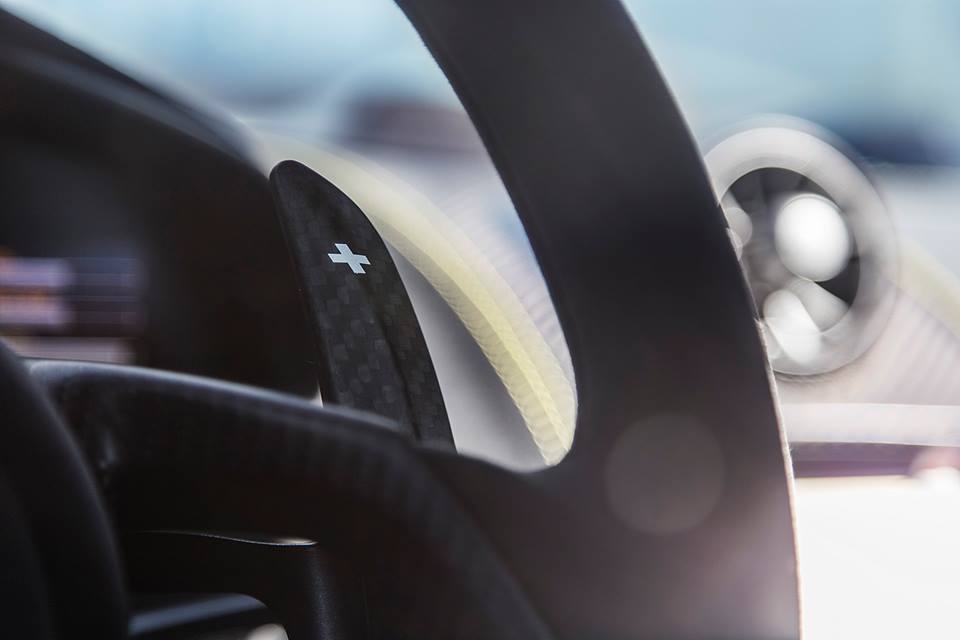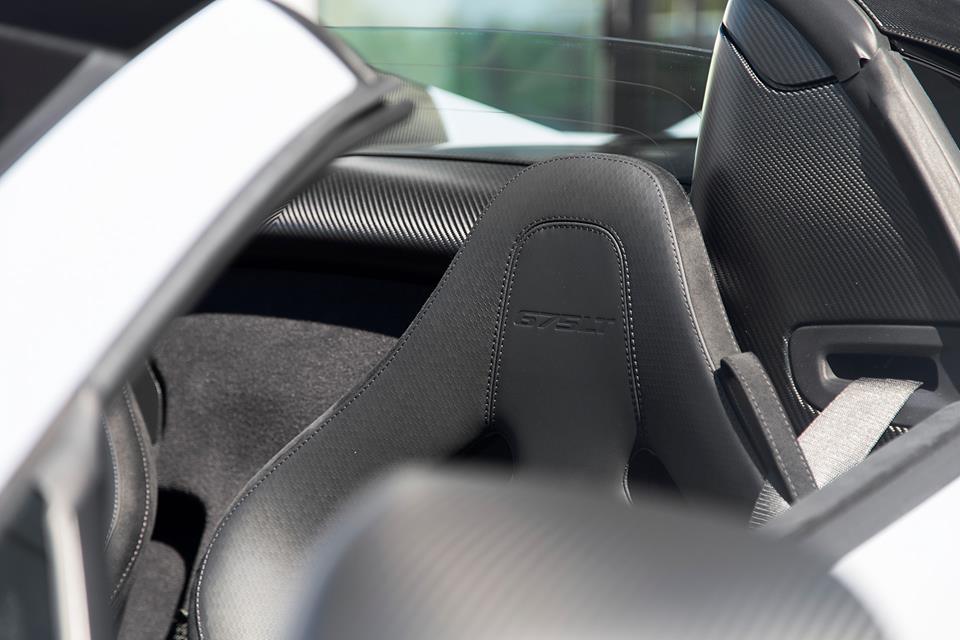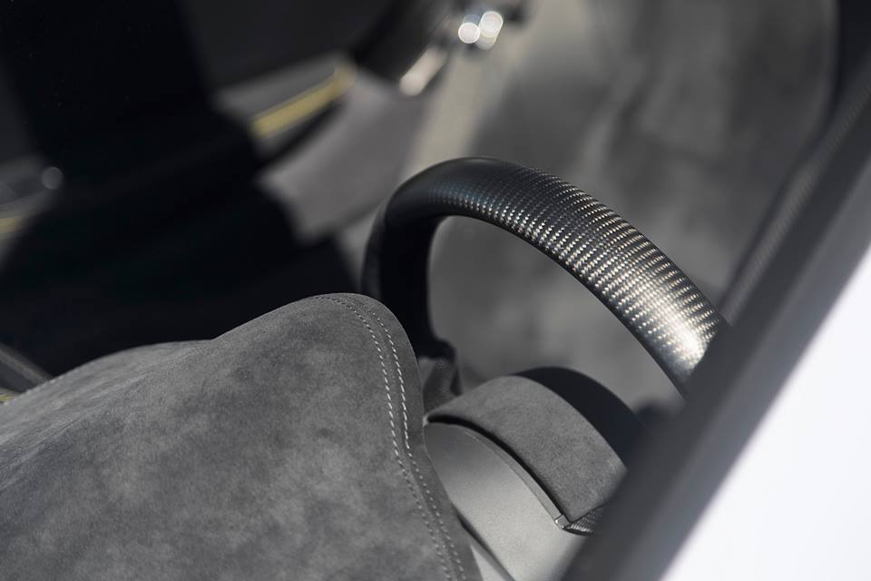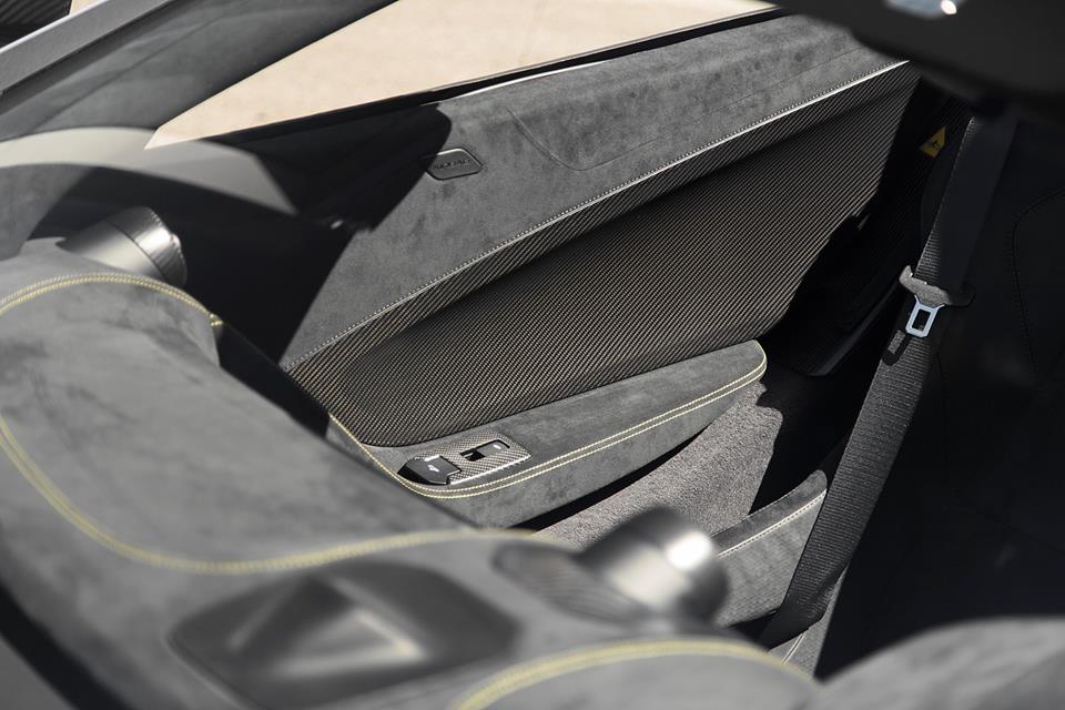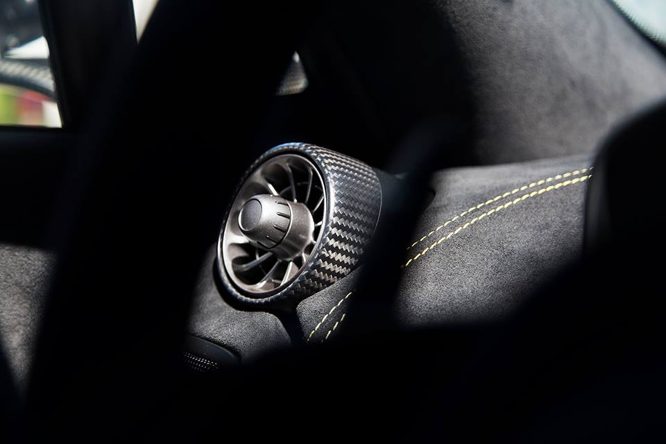 The interior is another unique part of the Ceramic Grey McLaren 675LT Spider thanks to features such as carbon and Alcantara steering wheel, carbon vent surrounds, one-piece bucket seats, and Solis painted Active panel dials. The want is strong with this MSO.