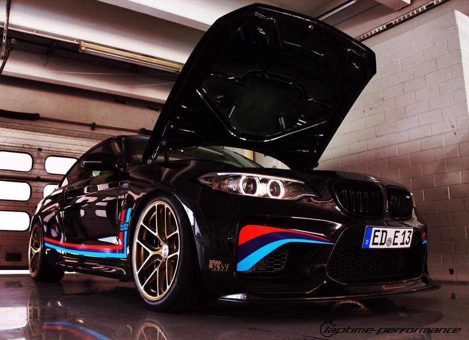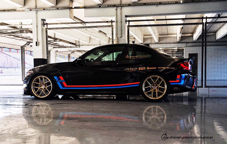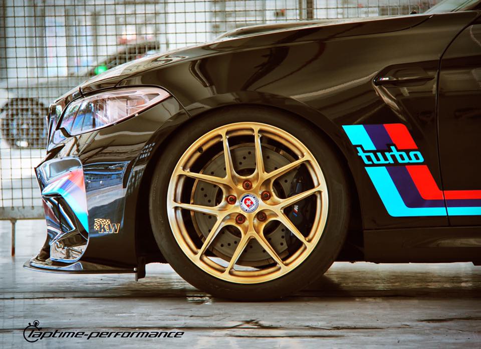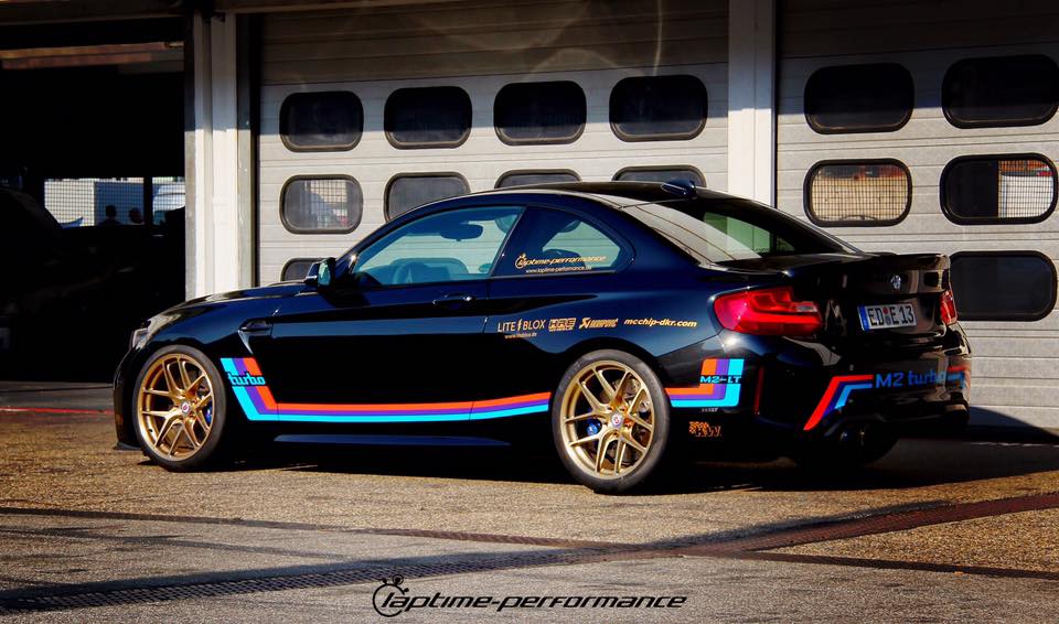 Boasting a full M Performance styling and livery package, Laptime-Performance BMW M2 is equipped by the tuner with a new “GTS” front lip spoiler, a CSL-style trunk lid and a full carbon fiber bonnet. These, in combination with the M livery and graphics and a set of HRE R101 19 inch wheels in brushed gold, give the car a unique look that half way between racing and luxurious.