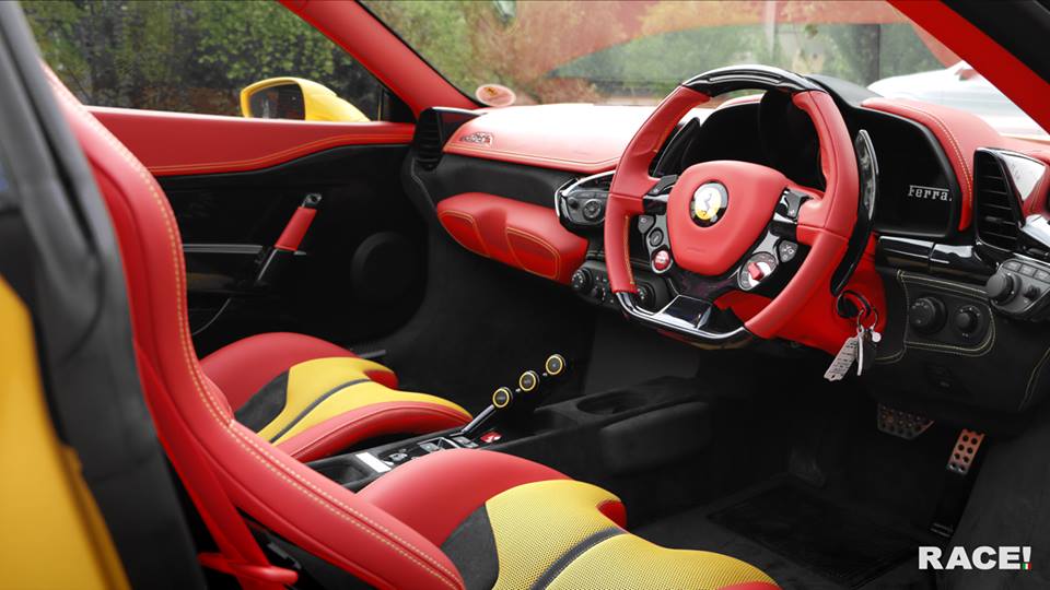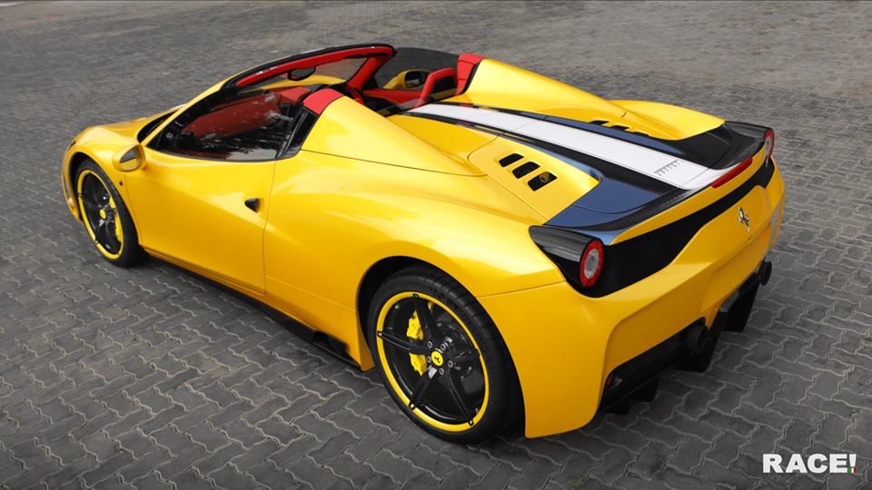 Beginning with a Speciale Aperta which is, as it clearly says in the name, a very special thing, RACE! tuners have added to the car a complete Novitec Rosso styling package as well as custom painted wheels. The wheels are painted to match the wonderful mix of yellow and dark blue stripes on the body of the car. And they work brilliantly, although we have to say we would rather the interior on this car wasn’t red as it kind of clashes with the rest of it.