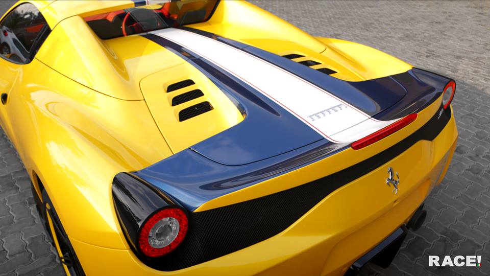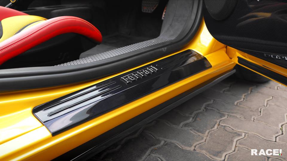 RACE! Novitec Ferrari 458 Speciale A features in terms of body kit a carbon fiber front spoiler lip, carbon fender vent bezels and inserts, side skirts, rear diffuser and rear boot lid wing, as well as small details such as carbon mirror arms, carbon door handles and fuel filler caps, and smoked lights. As mentioned, the wheels are painted to mirror the paint scheme on this car with dark blue spokes and yellow outer lips and brake calipers.