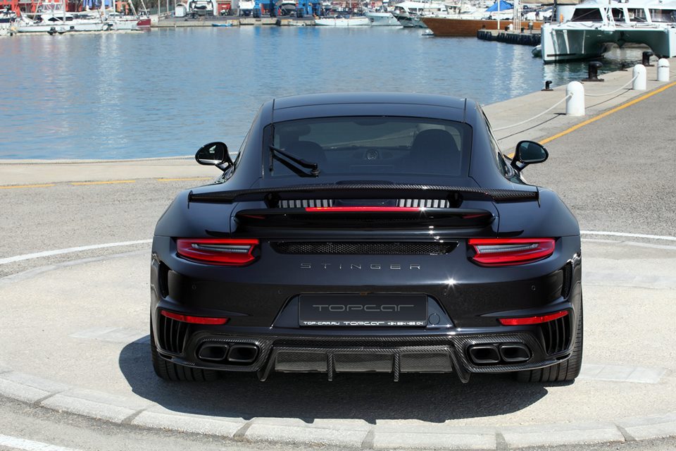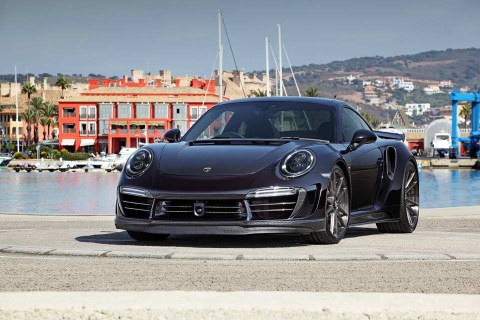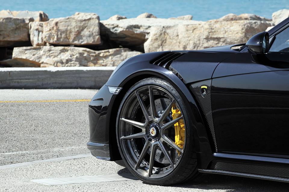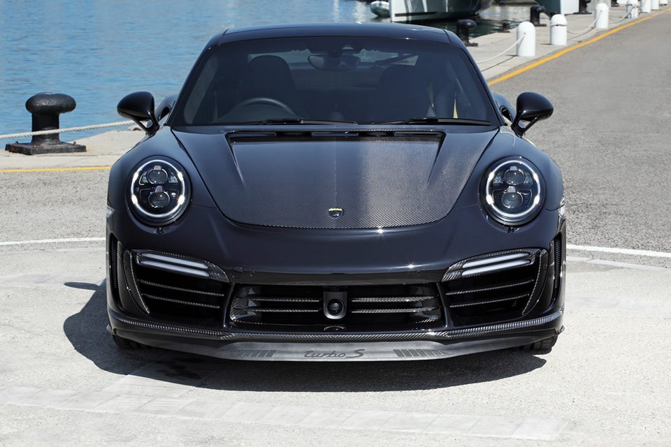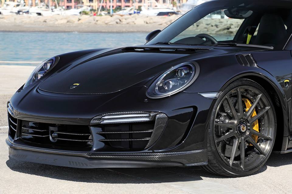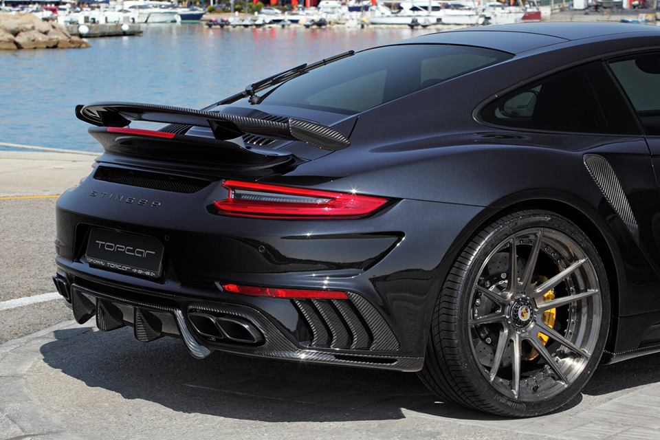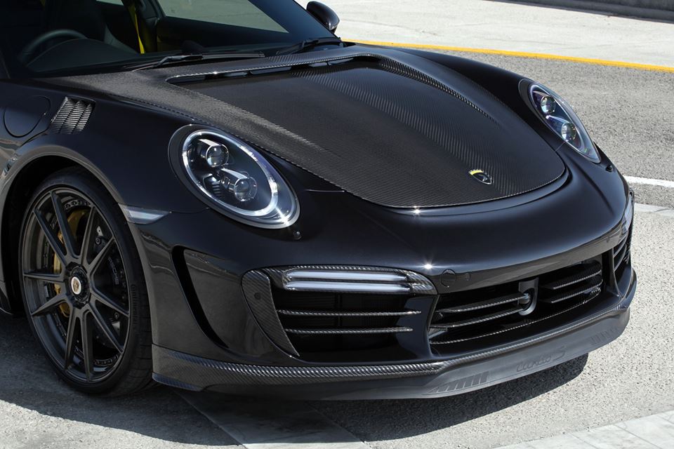 The ingredients of TopCar Porsche 991 Stinger GTR Gen II package include front and rear bumpers, front fenders with RS air ducts, carbon fiber hood, side skirts, door pads, super-wide spliced rear fenders, and rear spoiler, complemented with a set of custom ADV1 wheels.