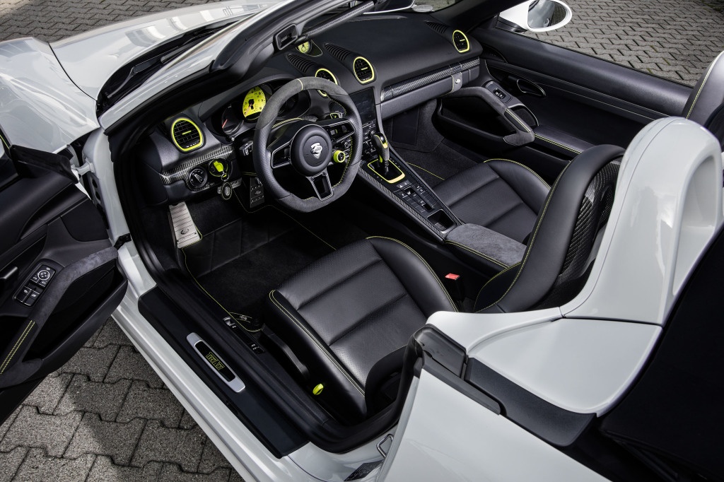 Besides the visual treatment on the outside, Techart Porsche 718 Boxster also gets a nice interior package the main highlight of which is a “Type 7” sport steering wheel uses the 911’s optional Porsche GT Sport steering wheel as its basis. This cool little wheel features exotic materials and designs in its construction such as finest leather, lacquered trims, carbon fiber segment, Alcantara, leather piping and maintains all the features of the standard unit. Custom-painted trims, details and decorative stitching are among the other features of the Techart cabin.