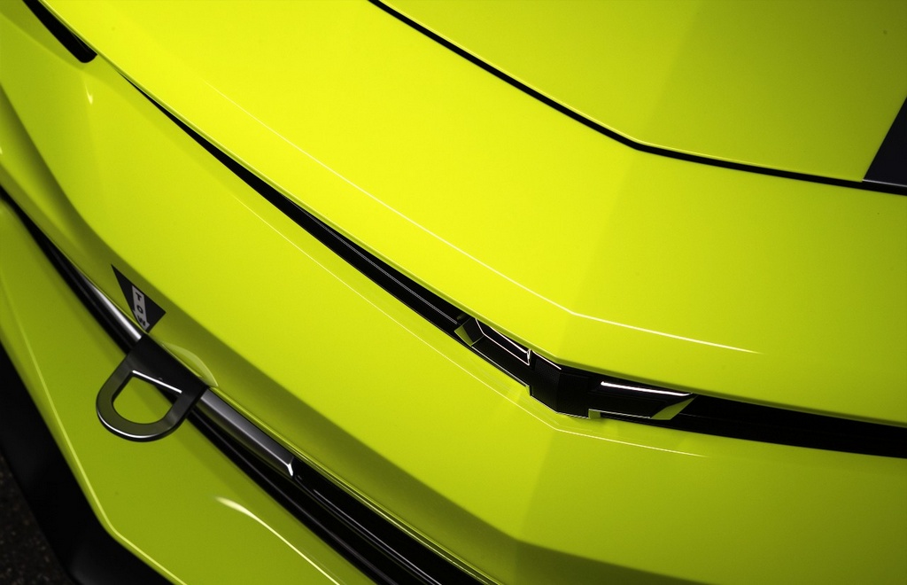 Engine-wise, the Shock Yellow Camaro with Pearl Nickel hood stripes and satin Carbon Flash Metallic accents on the hood vents, rockers and rear diffuser boasts on its 2.0 liter engine a cold air intake system, 20 pound pressure twin-scroll turbo, and Chevrolet Performance exhaust system with a polished 4-inch outlet.