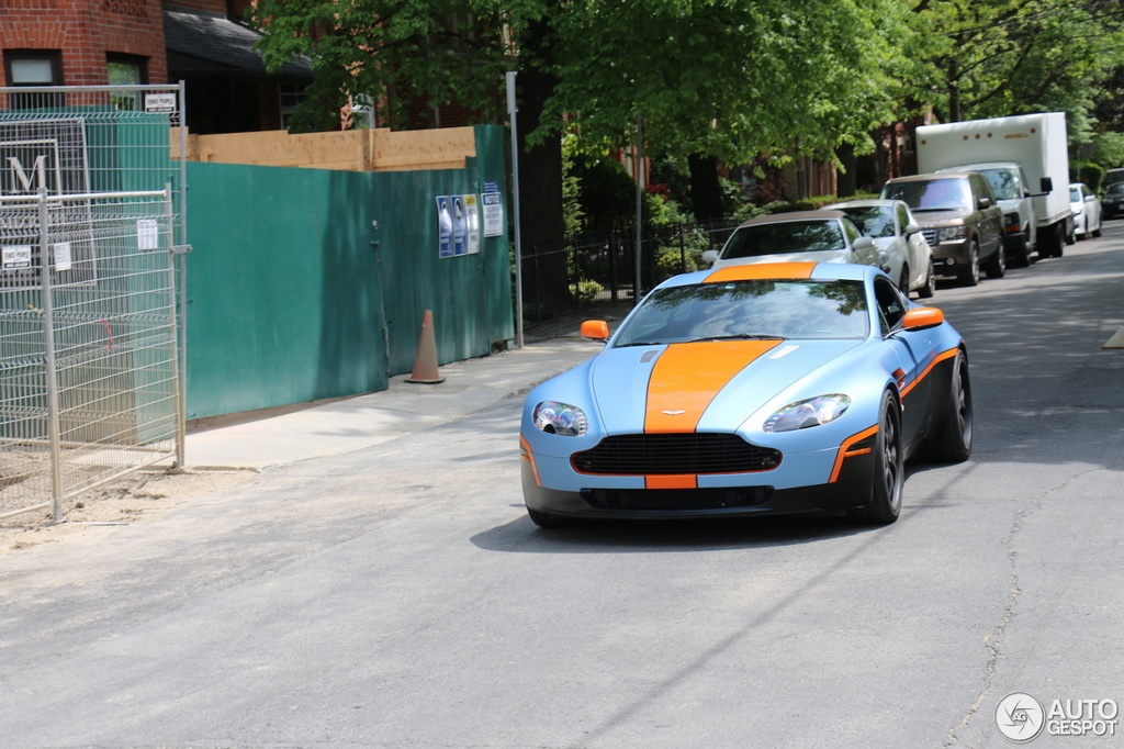 We have seen many different takes on the iconic Gulf livery, from a pop art interpretation of it to cool rusted depictions of the legendary colors. But we have never before seen a semi-Gulf livery, which is what’s featured on this Aston Martin Vantage sighted in Toronto.