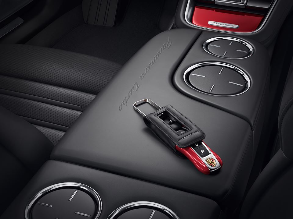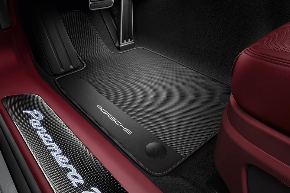 Moving inside this Porsche Panamera Turbo Executive, you are greeted by more Exclusive highlights such as two-tone black and carmine red leather with contrast stitching, carmine red accents on the dashboard and consoles, and Porsche emblem embossed on the head and armrests. As part of the Exclusive treatment, Porsche also supplies a rear seat entertainment package with the biggest headrest screen you ever saw in a car. Unique keyfobs and floor mats are included as well.