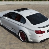 As for the styling kit, Prior Design BMW M5 wide body PD55X is one of the nicest packages for the F10 super saloon, what with the manly flared wheel arches, custom front and rear bumper with their splitter and diffuser, aero side skirts, and rear boot lid spoiler, all made from carbon fiber. The 560 horsepower sedan certainly looks more like it’s got 560 horsepower now, although that may not sit well with some M5 purists who believe he thing should look as unassuming as possible.