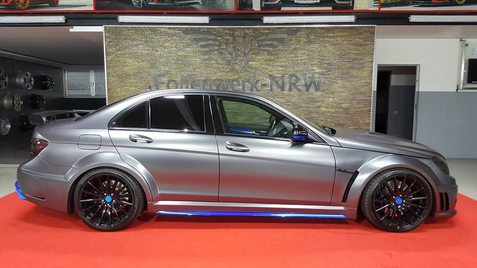 This bad boy has been given a Black Series conversion look from Prior Design complete with a nice wrap from Folienwerk-NRW. The styling package for Prior Design Mercedes C63 AMG is inspired by the real Black Series C63 which only came as a coupe and gives the sedan the same sort of swollen wheel arches, blacked-out lights, and enlarged aero parts. And it looks pretty good; kind naughty, but good.