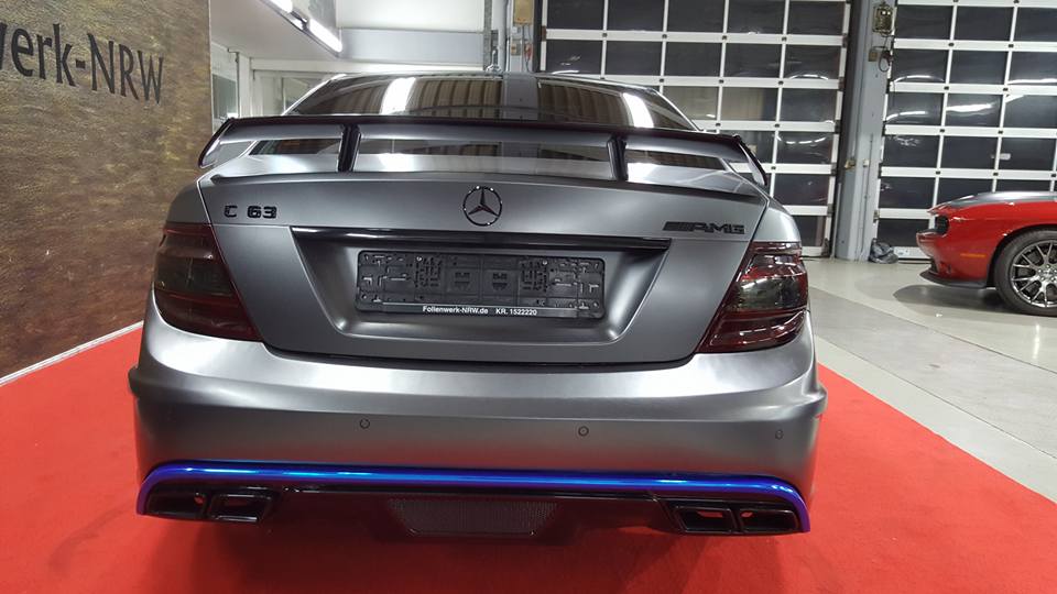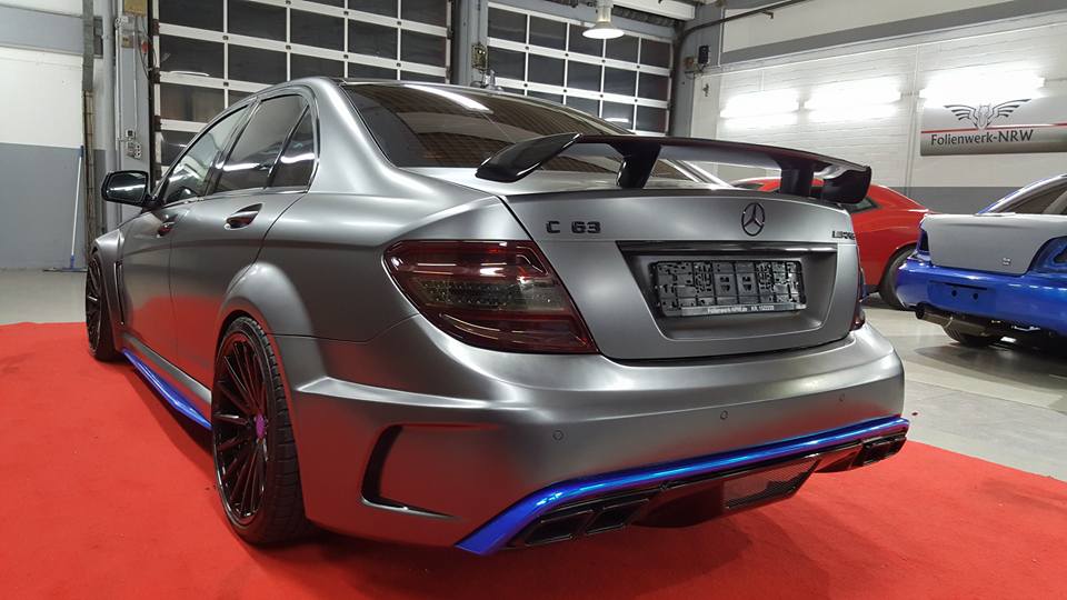 Of course, a large of part of sweet look is down to the Satin Dark Grey wrap which is complemented on this Prior Design Mercedes C63 AMG with some blue accents and a set of 19 inch wheels powder coated in black. Now, you can have a Black Series Merc with the regular engine if you are not that into speed and performance. But you can’t have one with regular exhaust note, which is why this C-Class is fitted with a custom AMG exhaust system with bespoke headers and mufflers.