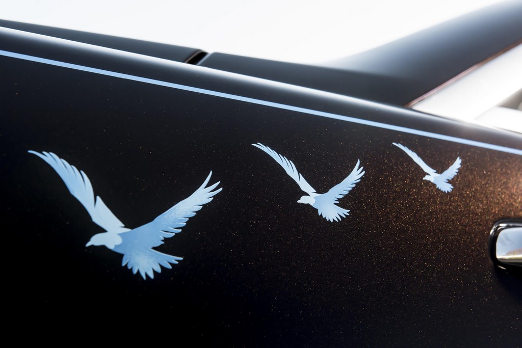 The second of Roger Daltrey CBE’s cars has been created in collaboration with Mike McInnerney, the artist responsible for the famous album artwork of The Who’s seminal 1969 album ‘Tommy’. McInnerney has worked with Rolls-Royce’s surface finish experts to create an extraordinary expression of the rock opera’s iconic sleeve design – this truly unique car features the cover artwork of the album applied to the bonnet. Daltrey and McInnerney sought to express other elements of the album artwork throughout the car, with the Lyrical Copper exterior finished with a blue coachline of a bird in flight, a reference to the album sleeve.