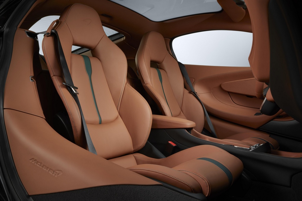 So what do you get for that 21 grand? On the outside, and besides the special colors, McLaren 570GT MSO XP Green features Saddle Tan aero pin-striping edging the front aero blades, side skirts and rear diffuser. There is also Union Jack emblem finished in silver-grey and MSO Black exterior components. Inside, you get Saddle Tan leather upholstery with green leather inserts in the seats and green contrast stitching, as well as a dedication plaque mounted on the centre tunnel beneath the infotainment screen identifying each car as one of six in the Collection.