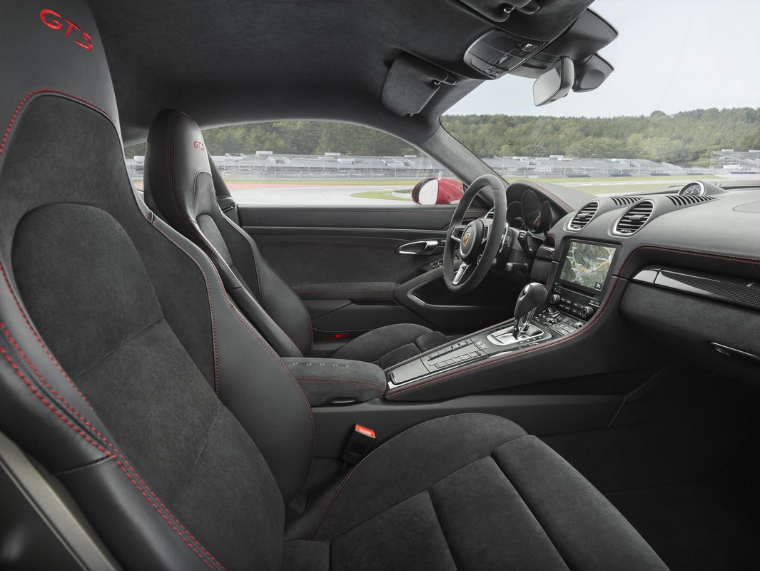 Visually, there are a number of cues setting the GTS models apart from the rest of 718 family. The biggest highlights include tinted front indicator lights and taillights, model designations in black, a black lower rear fascia, and black tips on the sport exhaust system, plus matte black 20 inch wheels. Inside you find Sport Seats Plus with alcantara and embroidered logo, and alcantara wrapped steering wheel.