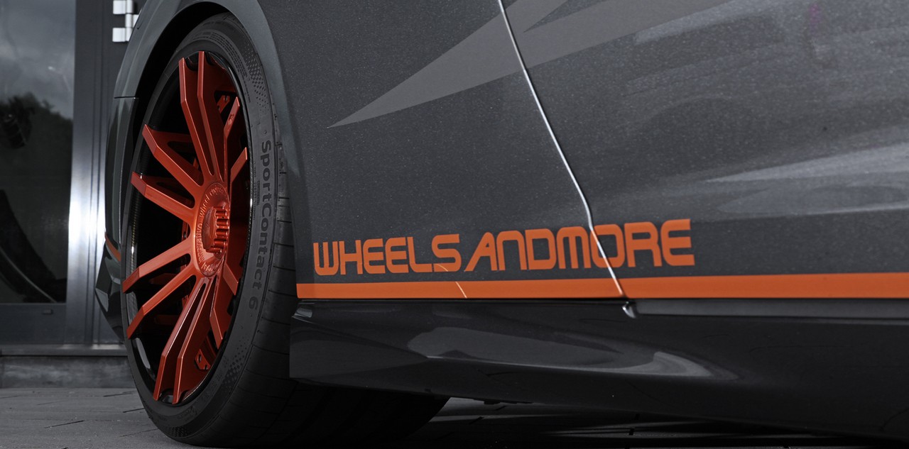 Looks-wise, WheelsAndMore Nissan GT-R steers clear of showy body kit, but makes up for it in orange wheels and graphics. The rims WaM has picked for the Crankzilla are a set of 3-piece F.I.W.E models measuring 9.5×21 inches on the front and 11.0×21 inches out back, wrapped with Continental tires in sizes 255/35/21 and 295/30/21 respectively. The wheels’ contribution to the car’s style is further enhanced by height-adjustable lowering springs from KW which drop the ‘Zilla by as much as 30mm.