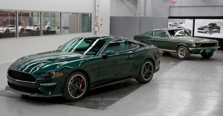 2019 Ford Mustang Bullitt features an upgraded 5.0 liter V8 engine fro the GT model with 475 horsepower and 420 ft/lbs of torque. It has a top speed of 163 mph and comes with subtle chrome accents, a 12″ all-digital LCD instrument cluster and Recaro black leather seats (optional) with unique green accent stitching. The VIN001 Bullitt will be produced in mid 2018 featuring the Dark Highland Green exterior like the movie car. Other production model can be ordered in a number of different colors as well.