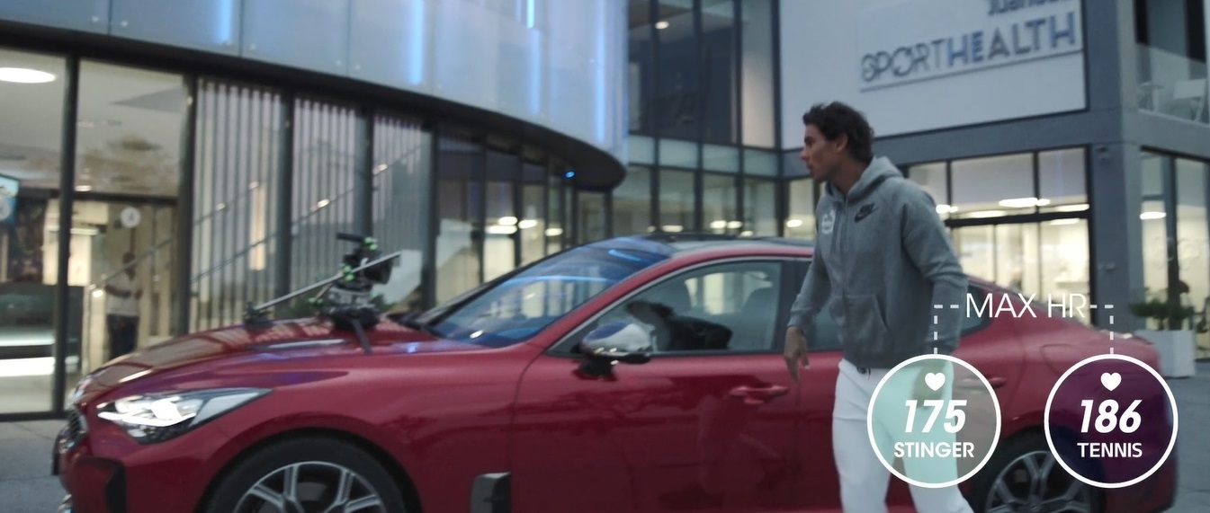 Raphael Nadal recently got delivery of his very own Kia Stinger, a top-of-the-line model with a 3.3-litre twin-turbo V6 engine. The tennis star was tested to see how excited he gets exactly driving this sporty gran turismo by measuring his heart rate. During what they call a “spirited” drive Nadal’s heart rate soared to 175 bpm – almost three times a second. That is only 11 bpm short of his on-court peak, which means the thrill he gets from this car is about as intense as that of a championship match.