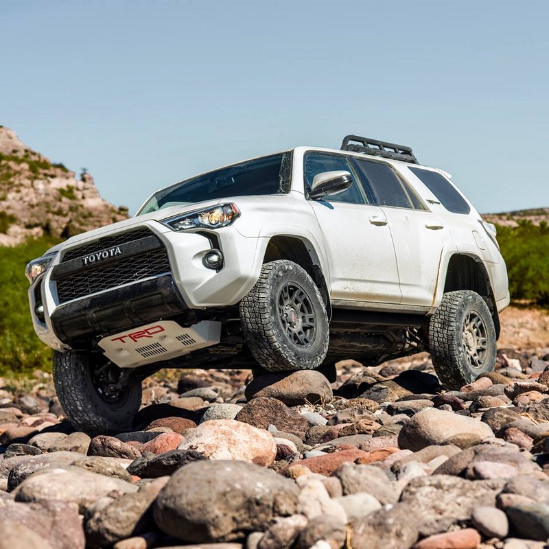 2019 4Runner TRD Pro: If you fancy a SUV then this model is a good one, featuring all the suspension goodies, a new roof rack, 1/4-inch-thick front skid plate, 17-inch matte-black TRD alloy wheels with 1 inch wider track, Nitto Terra Grappler P265/70R17 A/T tires, Entune Premium JBL Audio with Integrated Navigation and App Suite, TRD Pro floor mats, TRD shift knob, and red-stitched Softex seats with red TRD logos on the front headrests, LED fog lights, blacked-out TOYOTA grille, and projector-beam headlights with smoked trim.