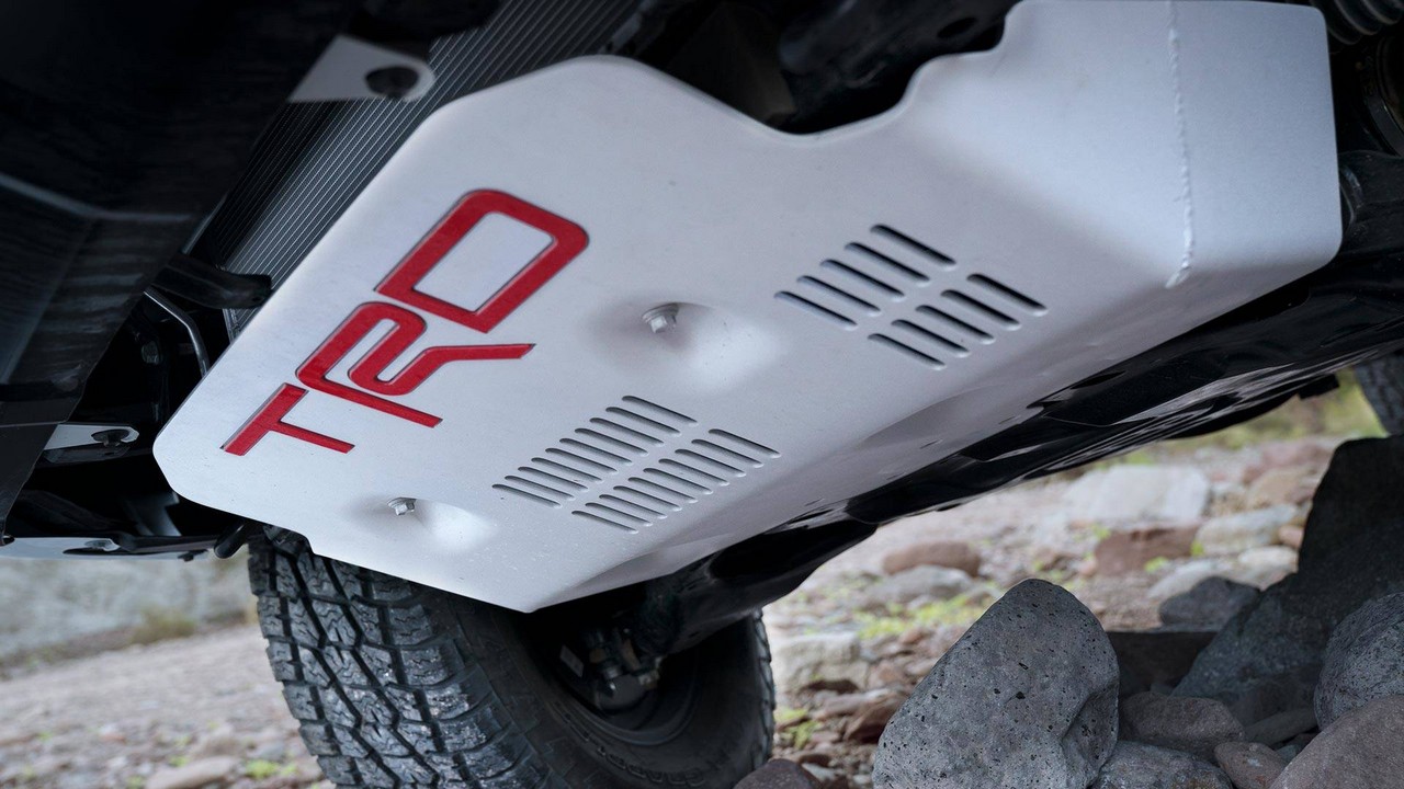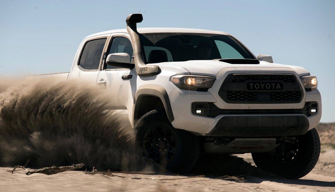2019 Tacoma TRD Pro: The biggest highlight of this one is a new and innovative TRD Desert Air Intake which even if you bury the vehicle under a tone of dust still provides the engine with fresh air. Other features include TRD-tuned springs, 2.5-inch rear shocks, updated front skid plate with TRD red lettering, while the cat-back TRD exhaust is accented with a new Black Chrome tip, Premium JBL Audio with subwoofer amplifier and Integrated Navigation and App Suite, special floormats, projector-beam headlights with black sport bezels and LED Daytime Running Lights (DRL), lotta cool badges, 16 inch wheels and P265/70R16 Goodyear Wrangler Kevlar All-Terrain tires.