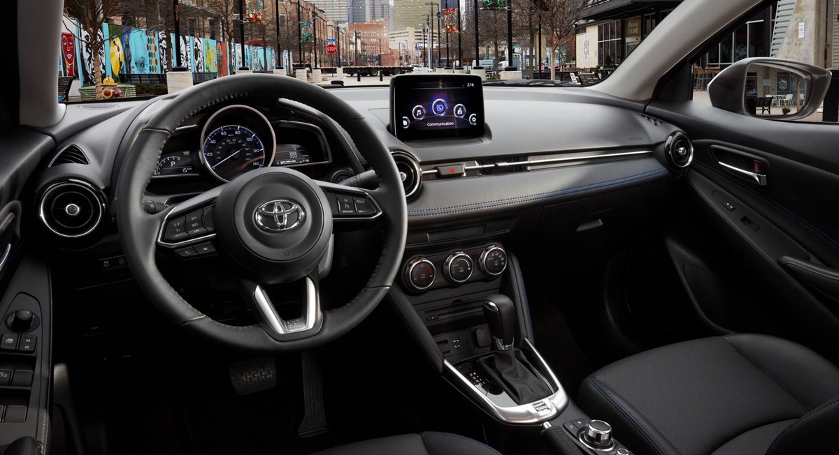 Being a good family car, the 2019 Toyota Yaris Sedan has a nice interior packed full of desirable features. A 7.0-inch touchscreen multimedia system with voice recognition, remote interface, steering wheel controls and Bluetooth connectivity is standard on all trims, and you can order satellite radio as well. There is also cruise control and push button start, 60/40-split rear seats, and safety systems such as Dynamic Stability Control (DSC), Traction Control System (TCS), Brake Assist (BA), Electronic Brake-Force Distribution (EBD), Anti-Lock Brake System (ABS) and a Brake Over-Ride System (BOS).
