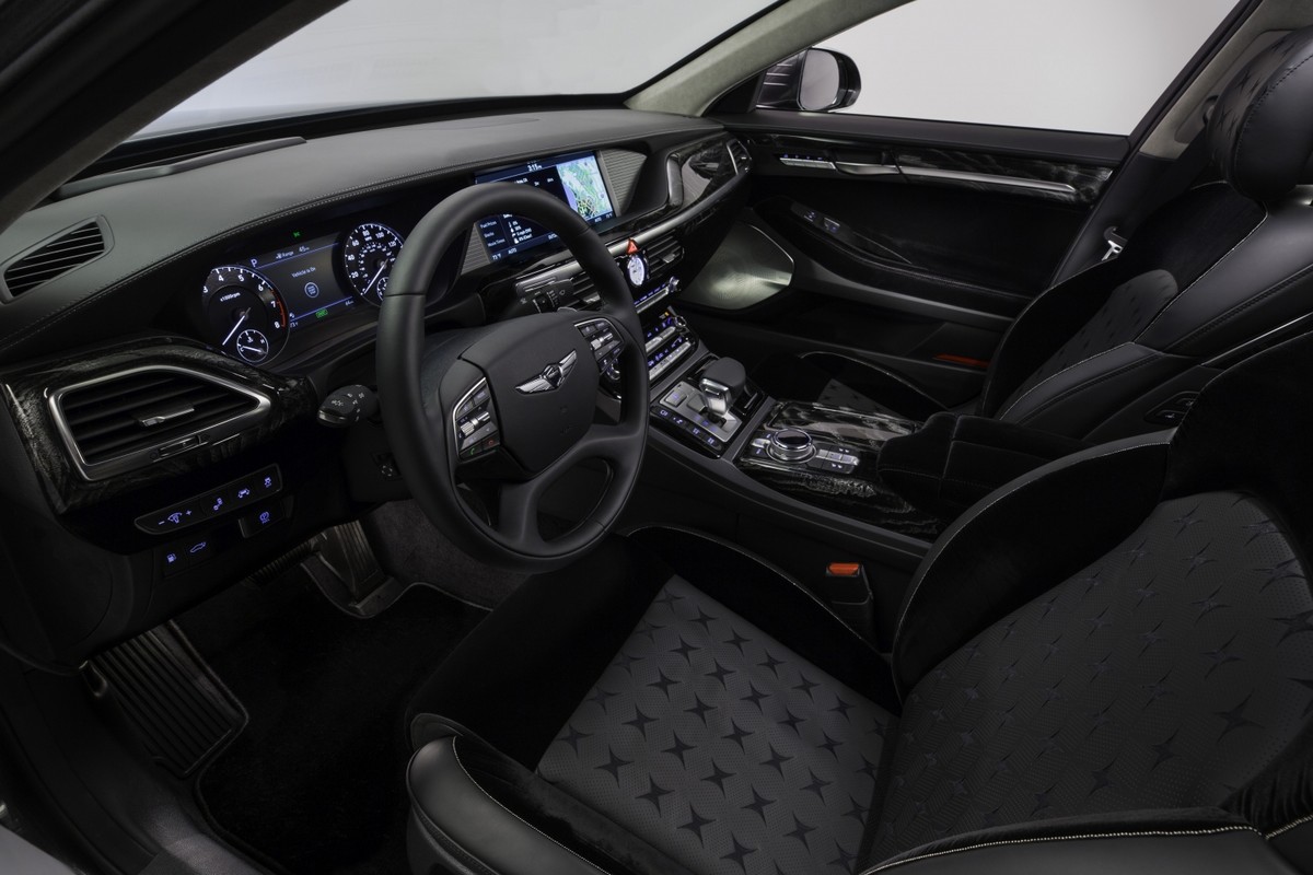 - Stardust: This G90 sedan practically sparkles under the award show lights, with deep flakes of dark gray. Tuxedo-style black velvet lines the cockpit.