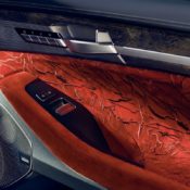 - The Ruler: This brick-red and gray G90 demonstrates a dynamic approach to the Genesis color and trim philosophy. The red Nubuck leather interior is enhanced by free-flowing, organic patterns reminiscent of a designer’s sketch.