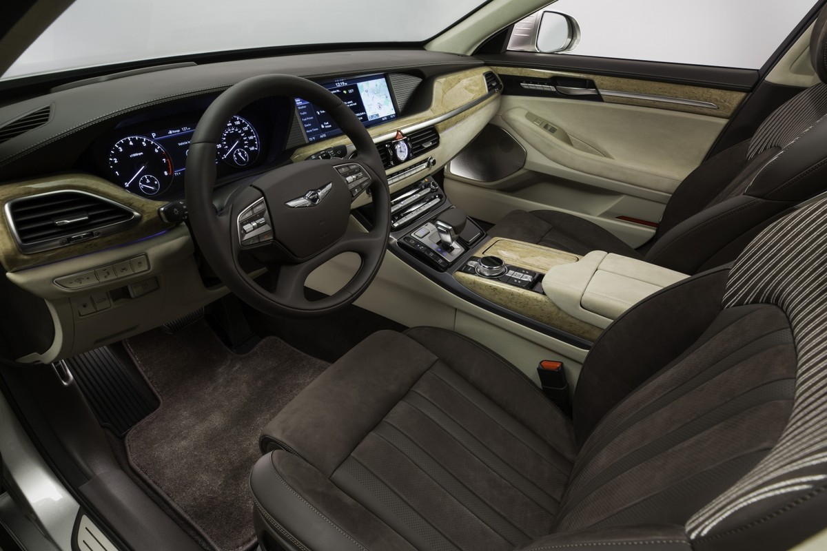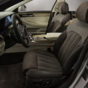 - Emerald Dream: Saturation is in the details of this G90 finished in complementary hunter green and dark brown. Inside, the Genesis logo is featured in a repeating geometric pattern in the green leather.