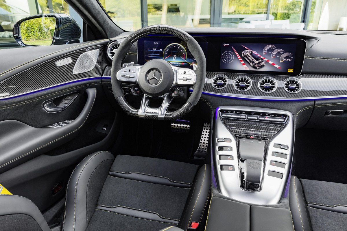 That means the 2019 Mercedes-AMG GT 4-Door Coupe, like any old AMG, comes in a bunch of flavors. The basic AMG GT 53 4-Door is like the Panamera S, boasting a 3.0-liter Inline-6 turbo engine with EQ boost. The innovative engine with additional electric charge-air compressor (eZV) and exhaust air turbocharger develops 492 horsepower. One level above this we have the 4.0 liter V8 with basic tune, meaning it has 577 horsepower. The fomer does o to 60 mph in 4.4 seconds and the latter in 3.3 seconds. Top Speed is 174 mpg for the 53 and 193 for the non-S 63.