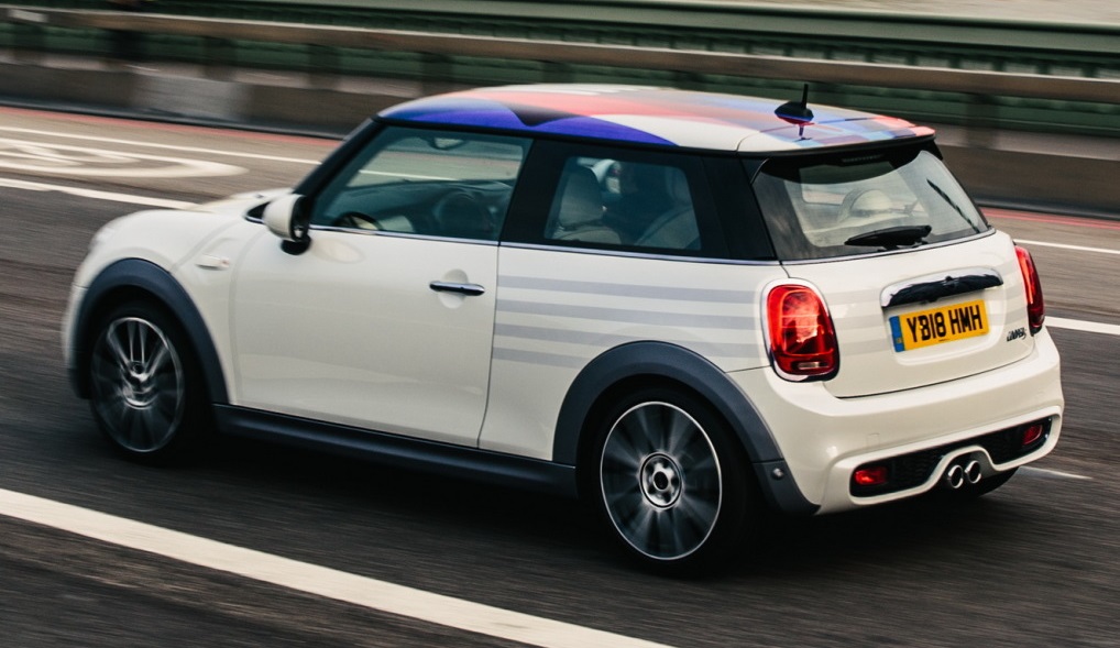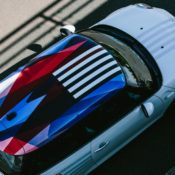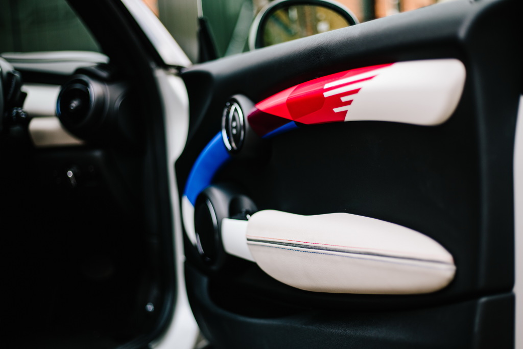 And while to the uninterested eye this special MINI might look like any other with a weird Union Jack painted on the roof, there are some nice details featured in it. The exterior is finished in Crystal White with matt silver and blue accents all around. Furthermore, the chrome parts have been treat to a blue-black tinted clear coat. The Union Jack mixed with Stars & Stripes on the roof, which is also mirrored in eh taillights, is hand painted, scuttles around the side turn signal indicators have been 3D-printed and embellish the initials M and H with a heart and rings.
