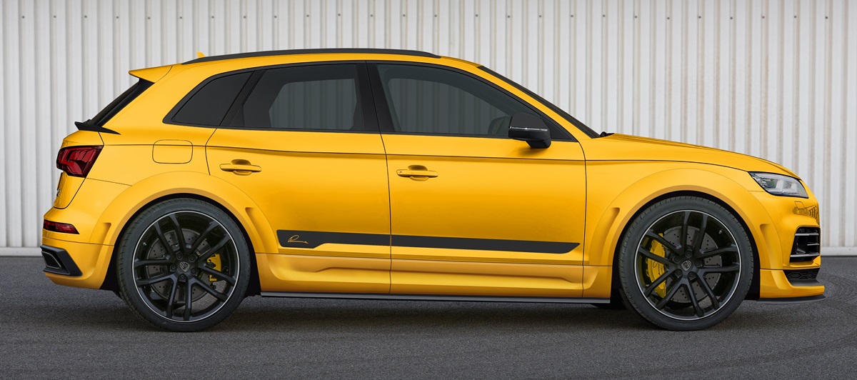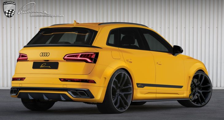 The ingredients of Lumma Audi SQ5 styling package include front spoiler extension, wheel arch extension front and rear, integrated side skirt under splitters, rear skirt extension with diffuser, door panelling front and rear, and square exhaust endpipe covers with LUMMA Logo. There is also an optional rear spoiler and a serialized plaque. Adjusted ride height and a set of large and sporty wheels wrap up the treatment.
