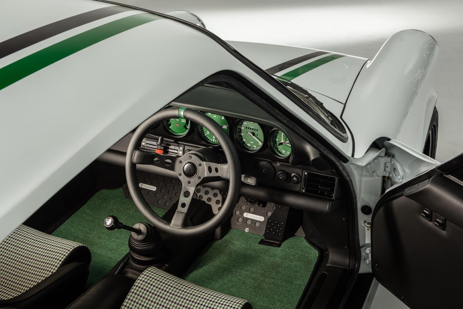 Starting with a 911 tub, Paul Stephens builds what he thinks a proper vintage 911 should be like. And a big part of that is lightness with the Clubsport model. The car has highlights such as lightweight de-seamed roof panel (including sunroof delete), lightweight composite bumpers and engine cover, lightweight aluminium bonnet, lightweight soundproofing and aerodynamically-designed lightweight external mirrors. Powering the Porsche 911 Le Mans Classic Clubsport is a 300 bhp, 3.4 litre air-cooled flat six, completely rebuilt and renovated to ensure trouble-free performance.