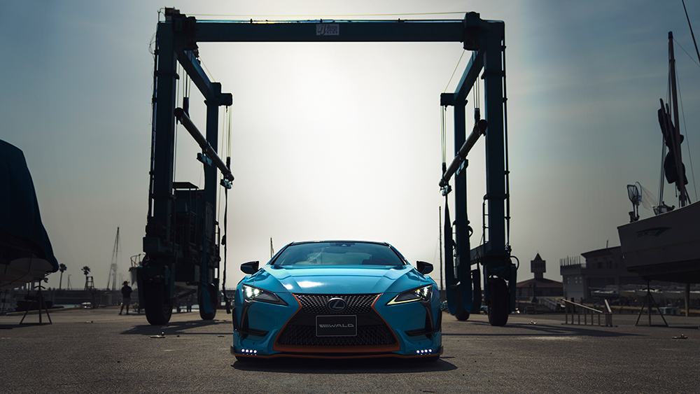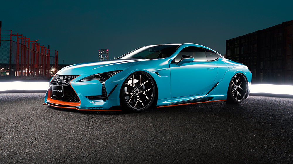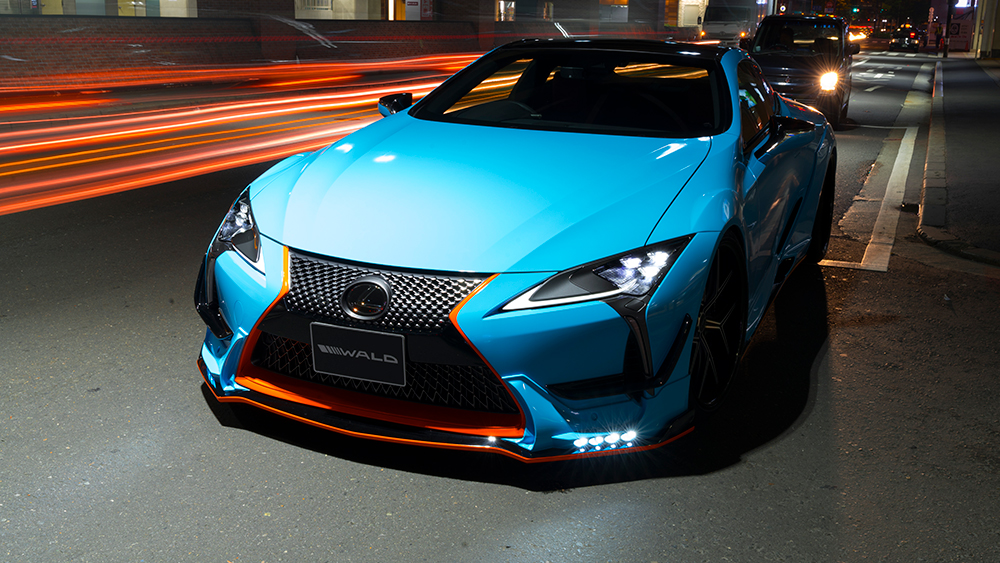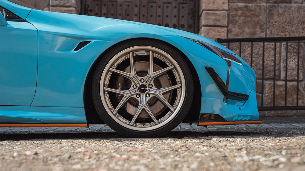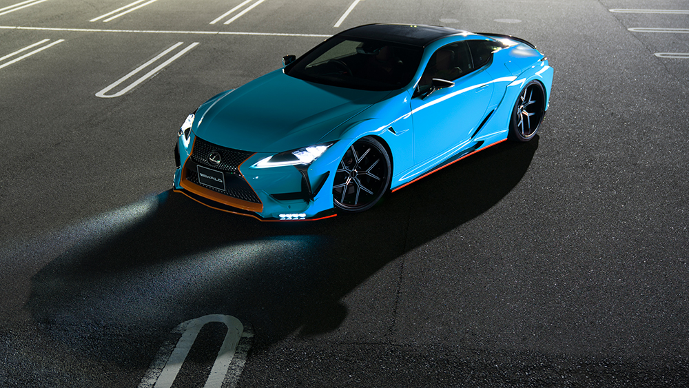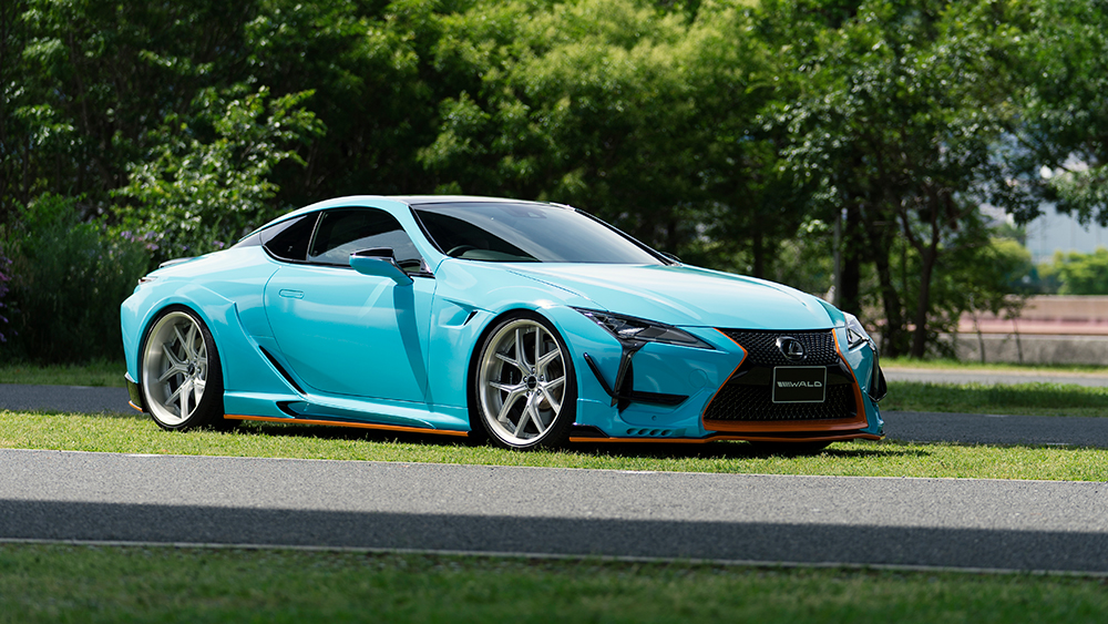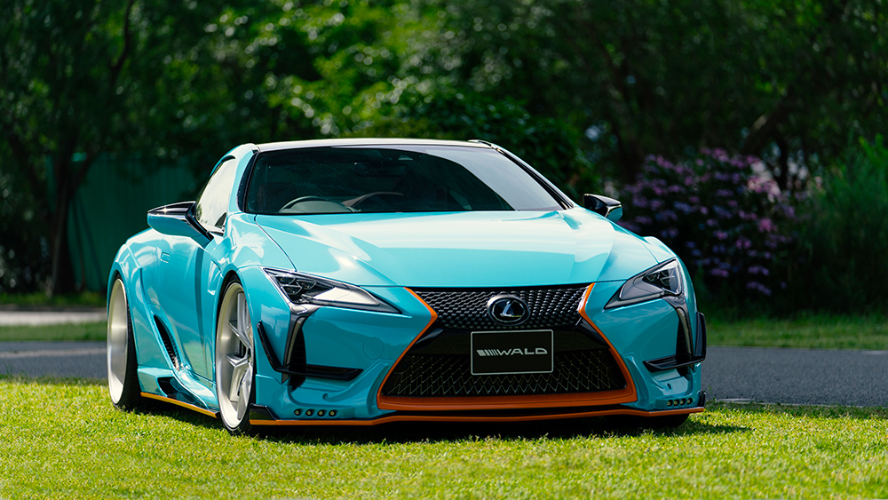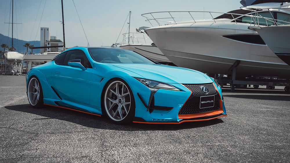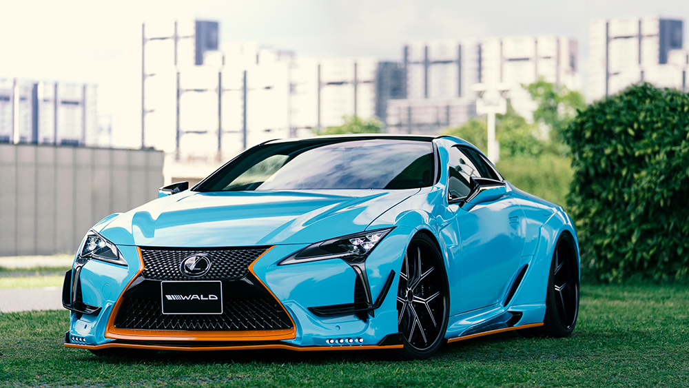 As for the Wald Lexus LC styling kit, though the paint job kind of obscures it, you can still notice the massive new chin spoiler with its LED lights and carbon-tipped aero parts. Then we have the overfenders and the dynamic side skirts that lend a sporty flair to the side view of the car. Out at the back you have a pronounced diffuser with new tailpipes and a neat boot lid spoiler.