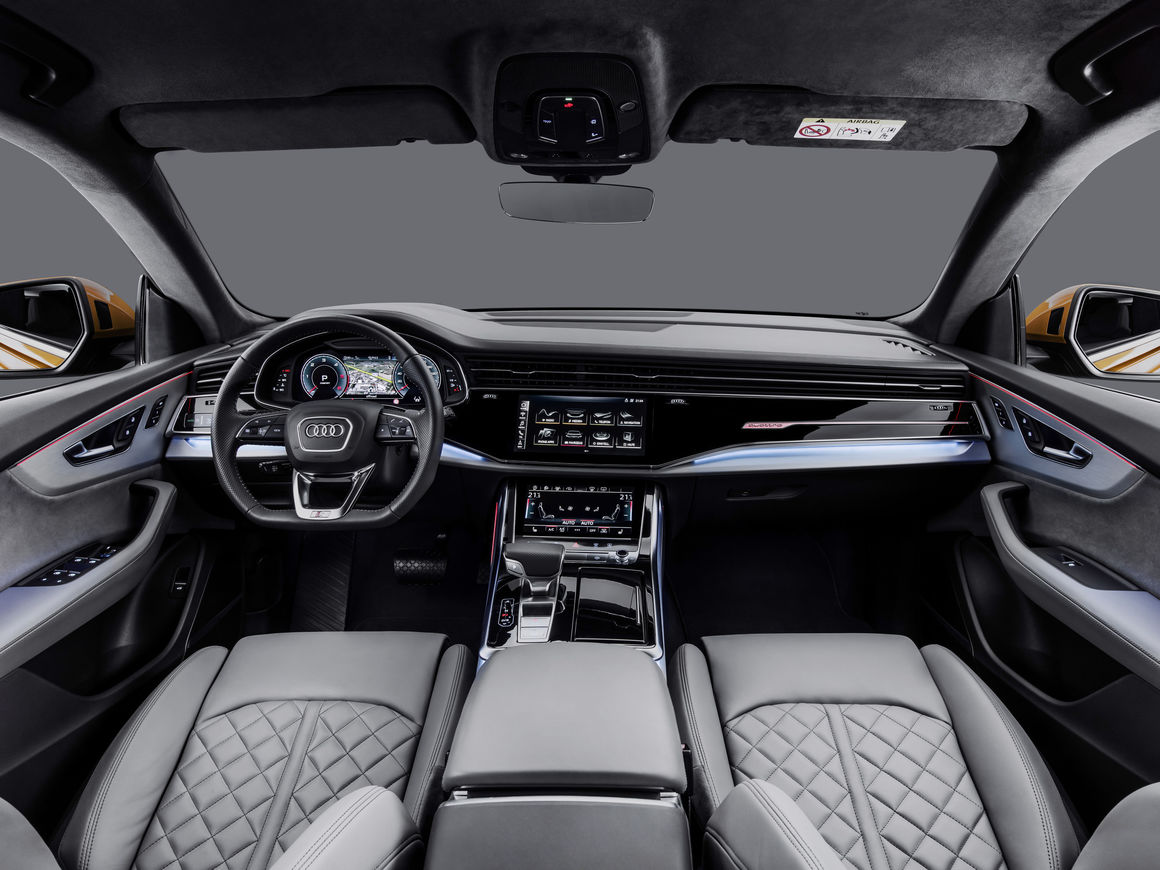 Standard features of the interior on the 2019 Audi Q8 include Q-design three-spoke multifunction steering wheel; three-zone automatic climate control; panoramic sunroof; heated eight-way power front seats with four-way power lumbar adjustment; lighting package. There is an available Luxury Package which adds ventilation and massage function and passenger seat memory, dual pane glass, extended leather on center console and door armrests. You also get Audi virtual cockpit featuring a 12.3-inch display and MMI touch response, as well as head-up display. Standard Audi smartphone interface provides access to Apple CarPlay and Google Android Auto, but Audi Phone Box does not come standard on base model.