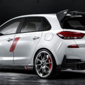 For the exterior, the i30 N Option offers carbon rear wing with the N emblem, carbon vented hood, quad mufflers and the N grille surrounded by a red character line, plus 20 inch lightweight alloys shod with high-performance tires. The show car also features a unique matt paint job which probably won’t be offered with the retail version. Inside the cabin the N Option treatment brings black carbon accents on the dash and air vents as well as doors and steering wheel, Alcantara on the steering wheel, sport bucket seats with red accents, sport pedals and gear shifter, and…